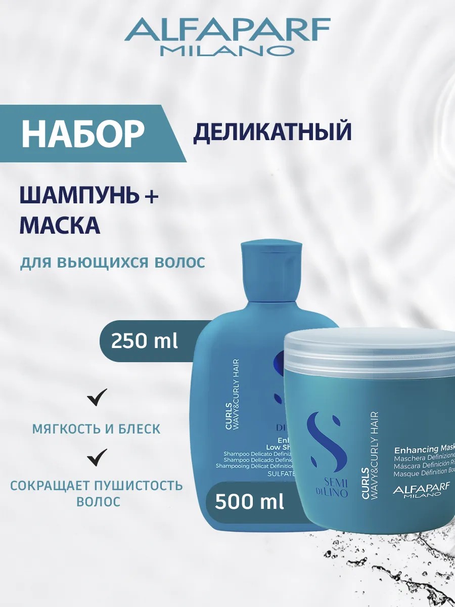 Набор деликатный для вьющихся волос состоит из: Шампунь деликатный для вьющихся волос Alfaparf Milano SDL CURLS 250 мл и Маска для кудрявых вьющихся волос Alfaparf Milano SDL CURLS 500 мл.