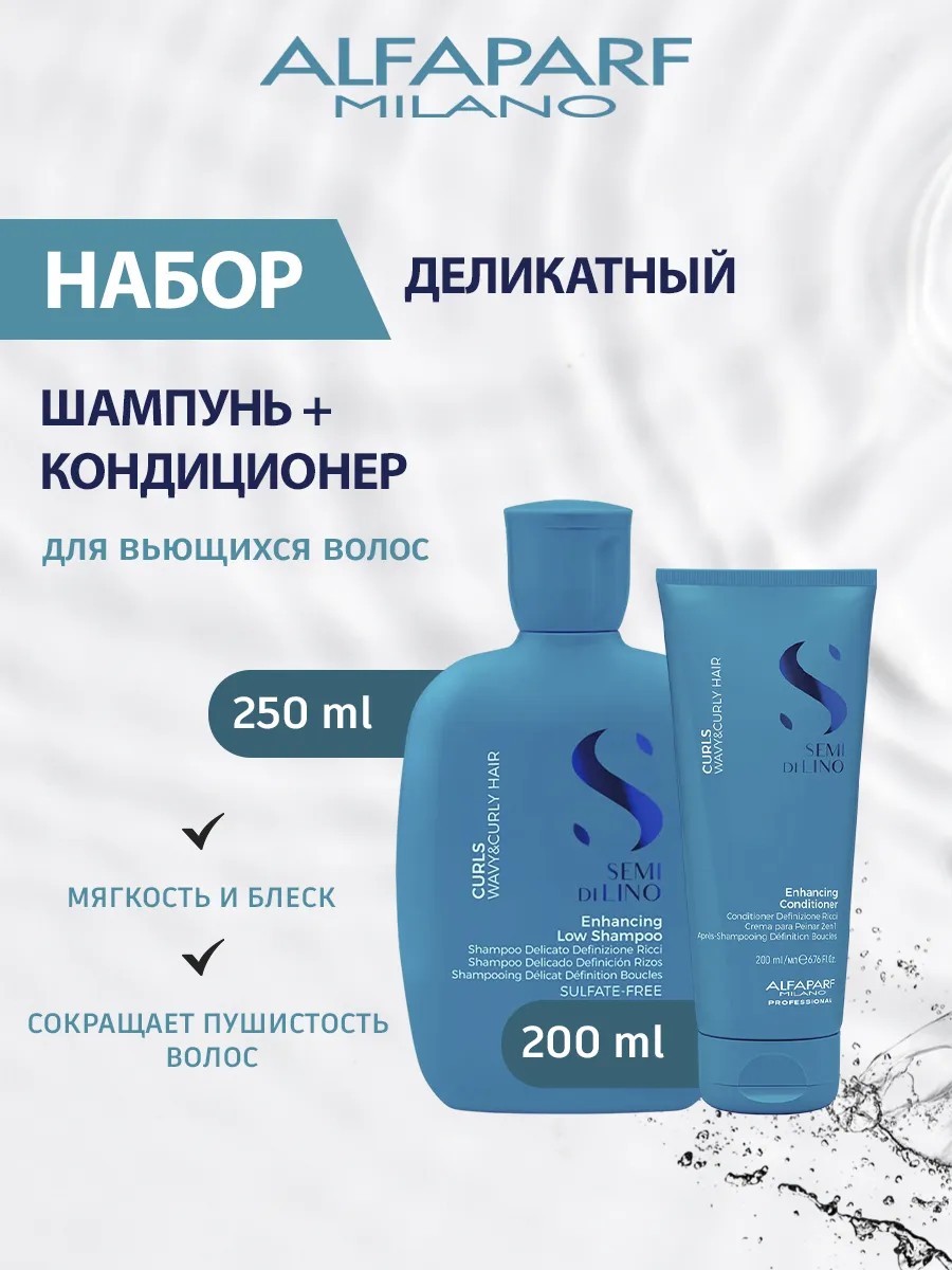 Набор деликатный для вьющихся волос состоит из: Шампунь деликатный для вьющихся волос Alfaparf Milano SDL CURLS 050 мл и Кондиционер для вьющихся волос Alfaparf Milano SDL CURLS 200 мл.
