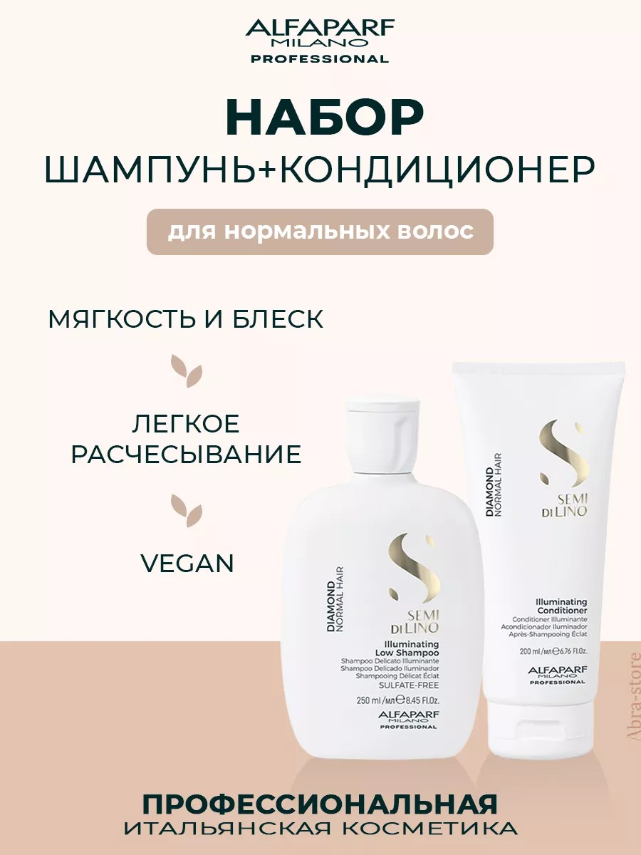 Комплект для бережного очищения и полноценного ухода за волосами Semi Di Lino от Alfaparf Milano представляет собой идеальное решение для тех, кто хочет обеспечить своим волосам мягкость, шелковистость и сияние. Шампунь Diamond Illuminating Low Shampoo обладает нежной формулой, которая мягко очищает волосы, придавая им мягкость и шелковистость. Он не содержит сульфатов, парабенов, парафина, красителей и минеральных масел, поэтому бережно заботится о волосах. Шампунь легко смывается и не утяжеляет волосы, а после его использования волосы легко расчесываются. Его легкий и приятный аромат не навязчивый. В состав шампуня входит мультивитаминный комплекс, который питает волосы и наполняет их жизненной силой, а также ненасыщенные жирные кислоты Омега-3 и Омега-6, которые ускоряют рост волос, улучшают их внешний вид, придают блеск и увлажняют. Этот шампунь идеально подходит для домашнего ухода. Кондиционер Diamond Illuminating также содержит комплекс Shine Fix Complex, который обеспечивает локонам сияющий блеск на протяжении 24 часов. Он также содержит Urban Defence Pro, который защищает волосы от агрессивных факторов окружающей среды. Комплекс сохранения цвета максимально продлевает насыщенность и стойкость цвета, а витаминный комплекс Multivitamin Complex интенсивно питает пряди, делая их мягкими и послушными без утяжеления. Продукты из коллекции Diamond также содержат УФ-фильтры и антиоксиданты, которые обеспечивают стойкость оттенка и блеск волос. После использования кондиционера, волосы не только приобретают блеск на 37%, но и восстанавливают свою структуру, получают защиту и сияние.