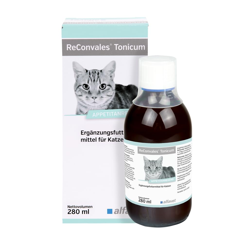 For nutritional recovery, convalescence and hepatic lipidosis in cats INGREDIENTS All-Natural DIRECTIONS FOR USE ReConvales Tonicum can be fed for 1 to 6 days, as a monthly course or continuously. Consult a veterinarian before using the food or extending its duration. SAFETY WARNING Recommended feeding duration: until complete recovery. ReConvales Tonicum can be fed for 1 to 6 days, as part of a monthly course or continuously. Before using the food or before extending a duration of use, consult a veterinarian. ReConvales Tonicum should not be used for feeding alone, as it contains too little energy. Suitable for dry or wet food. When feeding, the product should be at room temperature or slightly warmed. Composition: Thanks to the digestibility of the raw materials, the high energy content and the high concentration of essential nutrients, it is an ideal restorative food for the sick animal. Dental problems: Even in cases of painful diseases of the teeth and gums, the sugar-free and low-fat liquid is easily absorbed. Hepatic lipidosis: In this case, food intake is a prerequisite for recovery. Thanks to its high acceptance, the cat is encouraged to return to its natural eating behavior. Restorative food: Provides valuable nutrients to the sick cat in liquid form, without unnecessarily burdening the digestive process. The tasty tonic encourages animals to eat independently. Appetite stimulation: Helps combat poor appetite and insufficient digestive activity following operations, infectious diseases and gastrointestinal diseases. Pour la récupération nutritionnelle, la convalescence et la lipidose hépatique chez le chat INGRÉDIENTS All-Natural MODE D'EMPLOI ReConvales Tonicum peut être administré sur 1 à 6 jours, en cure mensuelle ou en permanence. Consultez un vétérinaire avant d'utiliser l'aliment ou de prolonger sa durée. AVERTISSEMENT DE SÛRETÉ Durée d'alimentation recommandée : jusqu'à la récupération complète. ReConvales Tonicum peut être administré pendant 1 à 6 jours, dans le cadre d'une cure mensuelle ou de façon permanente. Avant l'utilisation de l'aliment ou avant de prolonger une durée d'utilisation, demander au vétérinaire ReConvales Tonicum ne doit pas être utilisé pour l'alimentation seule, car il contient trop peu d'énergie. Convient pour les aliments secs ou humides. Lors de l'alimentation, le produit doit être à température ambiante ou légèrement chauffé. Composition : grâce à la digestibilité des matières premières, à la teneur élevée en énergie et à la forte concentration en nutriments essentiels, c'est un aliment reconstituant idéal pour l'animal malade. Problèmes dentaires : même en cas de maladies douloureuses des dents et des gencives, le liquide sans sucre et à faible teneur en graisses est facilement absorbé. Lipidose hépatique : dans ce cas, la prise de nourriture est une condition préalable à la guérison. Grâce à sa grande acceptation, le chat est encouragé à revenir à son comportement alimentaire naturel. Aliment reconstituant : procure des nutriments précieux au chat malade sous forme liquide, sans surcharger inutilement le processus digestif. Le tonique savoureux incite les animaux à se nourrir de façon autonome. Stimulation de l'appétit : Permet de combattre le manque d'appétit et une activité digestive insuffisante suite à des opérations, des maladies infectieuses et des maladies gastro-intestinales.