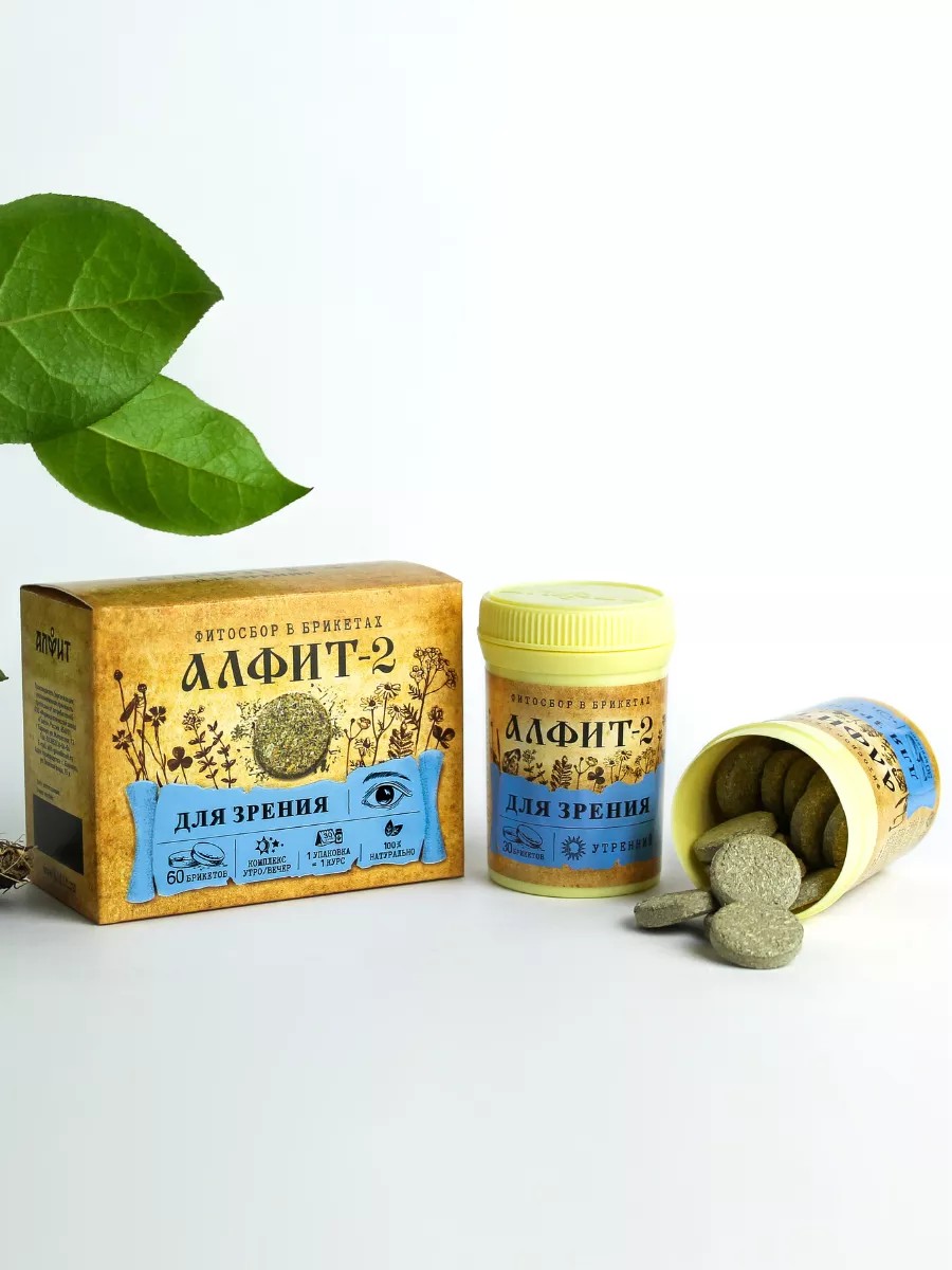 Витамины для глаз. Для зрения. Фитосбор в брикетах Алфит-2 для улучшения зрения разработан фитотерапевтами фармацевтического завода "Гален" и состоит только из лекарственных растений. Травы для глаз, входящие в состав, благотворно влияют на обменные процессы, способствующие улучшению зрения. Очанка в сочетании с лабазником и кипреем улучшают обменные процессы в хрусталике, препятствуя возникновению и прогрессированию катаракты. Левзея сафлоровидная усиливает иммунную защиту организма. Зизифора оказывает очищающее и дезинтоксикационное действие, улучшая обменные процессы в организме и непосредственно в глазных яблоках. Пустырник в вечернем сборе – седативный компонент. Брикеты это точная дозировка, удобное хранение и быстрое приготовление травяного настоя. В комплекте 2 банки - 30 брикетов для утреннего приема и 30 брикетов для приема вечером. Способ применения: 1 брикет залить стаканом кипятка, настоять 10-15 минут. Упаковка рассчитана на курс приема 1 месяц. Минимальный курс 1 месяц, при необходимости курс можно повторить. БАД для улучшения зрения. Для глаз. Алфит - 2 для улучшения зрения. Витамины для зрения. Травы для глаз.