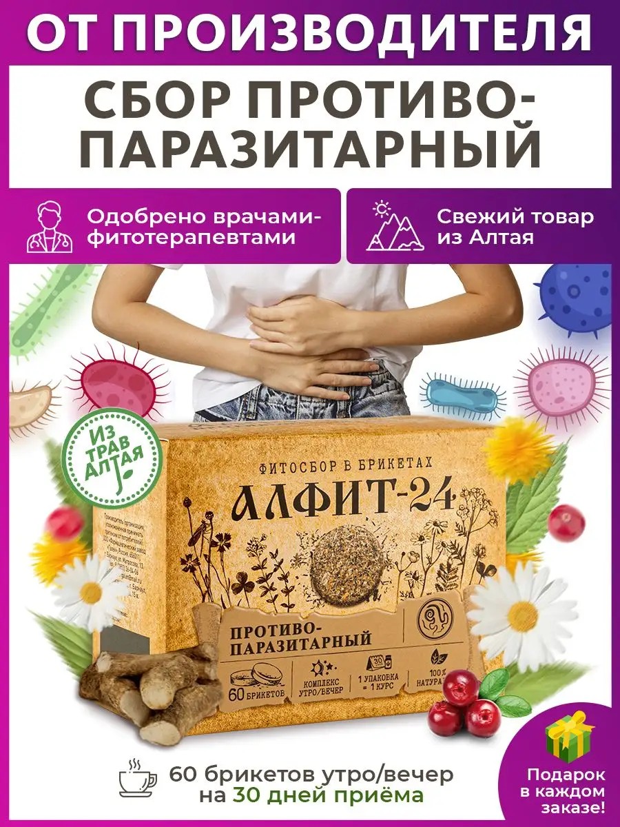 The herbal tea Alfit-24 has a pronounced antiparasitic effect and can be used as an adjunct in the treatment of intestinal helminthiasis, gallbladder and liver diseases caused by parasites, or intoxications resulting from parasitic activity. Alfit-24, a herbal remedy for parasites for humans, consists of crushed herbs with antiparasitic properties—tansy and birch leaves. This natural antihelminthic tea, cleansing tea, deworming remedy, anthelmintic, body cleansing, antiparasitic, and dietary supplement. Buckthorn bark helps remove weakened and dead helminths from the body. Oregano has a calming and mild anthelmintic effect. Tansy, with its hepatoprotective properties, helps improve liver health, while elecampane, with its anti-inflammatory effect, helps protect mucous membranes. Alfit-24 antiparasitic herbal tea is recommended for intestinal helminthiasis, intoxications caused by parasitic activity and powerful drug therapy aimed at their destruction, and parasitic diseases of the gallbladder and liver. Alfit 24 is an antiparasitic complex, including deworming tablets, human antiparasitic medications, antiparasitic herbal tea, lymphatic herbal tea, antiparasitic herbal tea for children, and liver tea. Aspen bark, burdock root, liver cleansing, tea infusions, detox, vitamins, intestinal cleansing, concentrate, extract, parasite cleansing, worms, low-calorie vegetarian Altai product, superfood, grocery, healthy eating, adaptogen, vitamins for women, vitamin complex, antiparasitic antiparasitic complex, cleansing, detox, removal of waste and toxins from the body from parasites, Parasitel Troychatka, antiparasitic stop, parasite stop, tablets, deworming remedy for humans, anthelmintic, vitamin herbal tea, herbal tea, medicinal, therapeutic dried Altai herbs for women, men, adults, and children are also helpful against parasites and helminths. The standard dose consists of 30 morning and 30 evening briquettes for brewing, designed for one month of intake twice daily. Directions: Brew one briquette twice daily, morning and afternoon/evening, 30 minutes before meals. For children 3 to 5 years old: 1/4 briquette twice daily. For children 5 to 12 years old: 1/2 briquette twice daily.