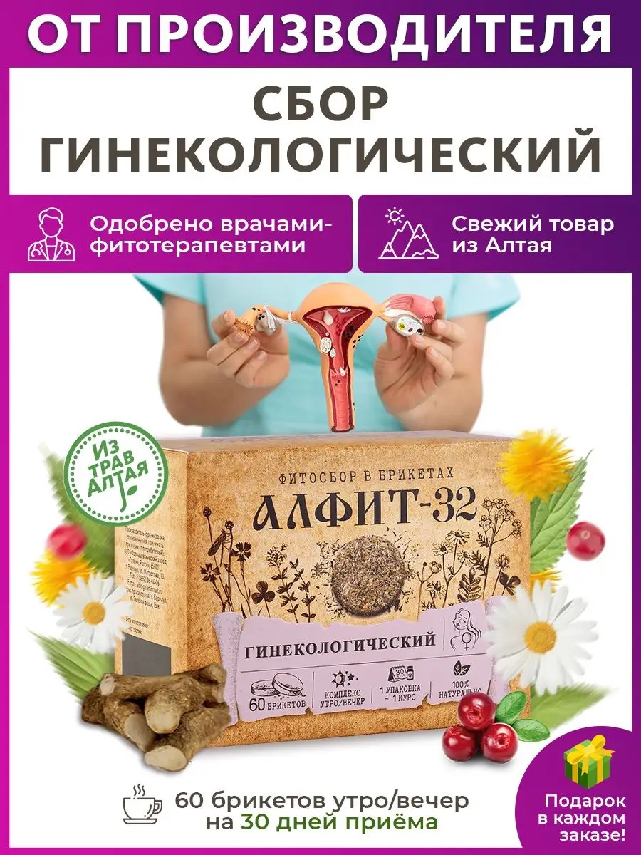 The standard consists of 30 morning and 30 evening briquettes for brewing, designed for one month of taking twice a day. A collection of herbs for women's health. Orthilia secunda, as a medicinal plant, is used to treat gynecological inflammatory diseases, uterine fibroids, infertility, uterine bleeding, toxicosis, menstrual irregularities, adhesions, obstruction and inflammation of the tubes. Alchemilla vulgaris has astringent, hemostatic, diuretic, anti-inflammatory, and wound-healing properties. Alfit 32 herbal collection, Altai herbal tea, gift tea drink, medicinal herbs of Altai, vitamins for women and men for gynecological health, gynecology, fibroids, uterus, infertility, uterine menstruation, ovaries. Peony has long been used as an antitumor and absorbable agent. It also has a pronounced anti-stress effect. Hop cone preparations are used for gynecological conditions, including menstrual irregularities, amenorrhea, hypomenstrual syndrome due to ovarian estrogen deficiency, and algomenorrhea. Duckweed stimulates hormone production, thereby accelerating metabolism. Meadowsweet improves blood microcirculation and tissue metabolism. Red root has an adaptogenic effect, helping to normalize hormonal balance. Brew Alfit-32 Gynecological, one briquette twice daily—morning and afternoon/evening, preferably 30 minutes before meals. Pour 200 ml of boiling water over the briquette, stir, and let it steep for 7-10 minutes, allowing the herbs to settle. Consuming the sediment is unnecessary, as 95% of the beneficial substances are contained in the infusion. Partial or complete ingestion of the sediment is possible; it primarily contains fiber. For more comfortable consumption, the infusion can be strained. For children aged 3 to 5 years: 1/4 of a briquette twice daily. For children aged 5 to 12 years: 1/2 of a briquette twice daily. For anyone prone to allergic reactions, we recommend starting with 1/4 of a briquette. The minimum course of treatment is one month. For exacerbations of chronic diseases, two or three courses with weekly breaks are advisable. Several infusions can be taken simultaneously, alternating them every other day or combining two infusions daily. Take the morning infusion in the morning and before lunch. Take the evening infusion in the evening and before bed. This infusion has an astringent effect and requires careful use and a laxative diet if prone to constipation. For those prone to allergic reactions, we recommend starting with 1/4 of a briquette, as individual intolerance to individual components is rare. Consult a physician before using during pregnancy or lactation. Alfit-32 gynecological, a medicinal herbal supplement, is used to treat inflammatory gynecological conditions, uterine fibroids, infertility, uterine bleeding, toxicosis, menstrual irregularities, adhesions, obstruction, and inflammation of the fallopian tubes.