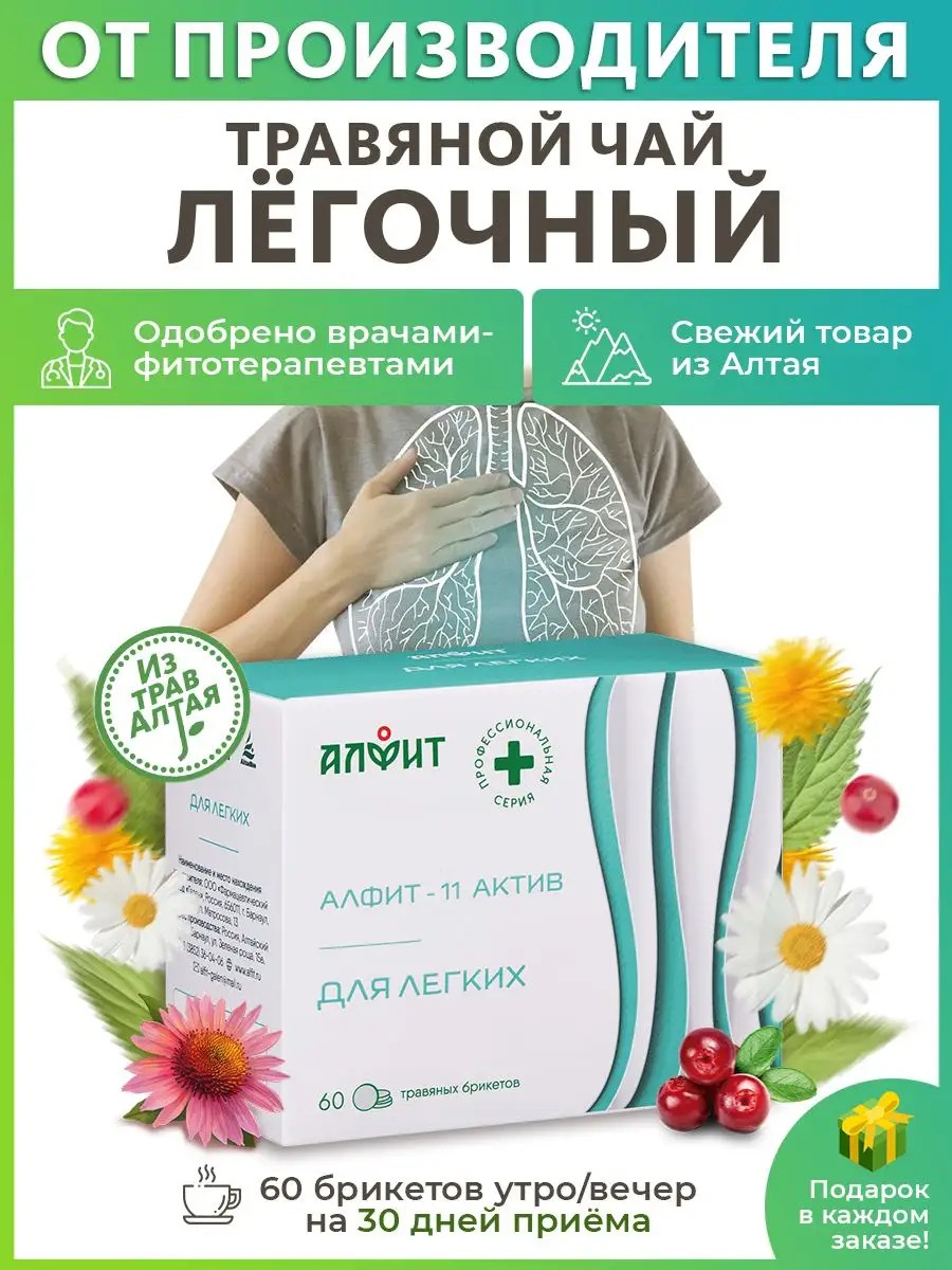 Алфит 11 - уникальный целебный травяной сбор и фиточай для лечения и профилактики заболеваний органов дыхания. 100% натуральный состав. Помогает сбор трав от кашля от простуды и других заболеваний верхних и нижних дыхательных путей. Фитопрепарат грудной сбор содержит экологически чистые алтайские травы лечебные . Выделяясь через дыхательные пути, эфирное масло багульника, девясила, эвкалипта оказывает антисептическое и отхаркивающее действие. Сапонины усиливают отхаркивающий эффект, глицирризиновая кислота корень солодки проявляет мощное противовоспалительное действие. Слизистые вещества пролонгируют лечебный эффект средства от кашля. Трава подорожник повышает иммунитет, крапива оказывает дополнительный противовоспалительный и общеукрепляющий компонент, пустырник обеспечивает седативный успокоительный эффект.БАД алфит 11 - это чайный напиток , биологические добавки , мультивитамины , витамины и бады для здоровья женщин и мужчин, для подростков и детей, а также отличный подарочный чай .Полезный витаминный алтайский травяной чай рекомендуется при заболевания легких различной этиологии: острые респираторные заболевания, фарингиты, бронхоэктатическая болезнь, трахеобронхиты, пневмонии. Как дополнительное средство сбор используется при раке легкого, при метастазах в легкие и легочном туберкулезе.Способ применения: 1 брикет залить 200 мл кипятка, настоять 7-10 минут, принимать чай в брикетах за 30 мин до еды. Фитосбор для взрослых и детей состоит состоит из 30 утренних 30 вечерних брикетов для заваривания, рассчитанных на 1 месяц приёма 2 раза в день.Противопоказания: индивидуальная непереносимость отдельных компонентов, беременность и лактация
