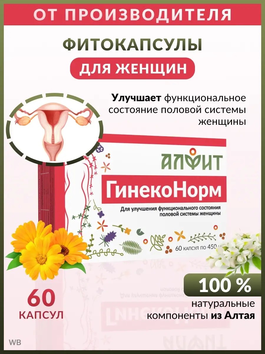 Капсулы Гинеконорм - фитосбор лечебных алтайских трав в капсулах для улучшения функционального состояния половой системы женщин. Стандарт состоит 60 из капсул по 0,45 г. каждая. Входящие в рецептуру лекарственные травы фитосбора обладают следующим действием: трава боровая матка применяется как женский гинекологический сбор для лечения гинекологических заболеваний воспалительного характера, фибромиомы матки, бесплодия, маточных кровотечений, токсикозов, нарушений менструального цикла, спаечных процессов, непроходимости и воспаления труб, боровая матка капсулы, травы для женщин от приливов при климаксе, боровая матка сбор. Гинеконорм бад для здоровья женщин климакс боровая матка гинекологический сбор женский витамины и бады. Обладает боровая матка таблетки противоопухолевым, противовоспалительным, рассасывающим, противомикробным, мочегонным и обезболивающим действием, стимулирует иммунную систему. Она помогает улучшить функциональную активность матки и придатков, снять воспалительные процессы в почках и мочевом пузыре. Манжетка содержит катехины, дубильные вещества, липиды, флавоноиды и кислоты – производные фенолкарбоновых. Манжетка применяется для нормализации менструального цикла, восстанавливает гормональный баланс фон. Растение помогает снизить уровень холестерина в крови и обладает крововостанавливающими свойствами. Растение зопник может быть рекомендовано при женских недомоганиях, а также эффективно как желудочное желчегонное противовоспалительное и успокаивающее средство. Календулу в лечебных целях применяют, как антисептическое, противовоспалительное, ранозаживляющее средство. Препараты шишек хмеля применяются при гинекологических заболеваниях - нарушениях менструального цикла - аменорее, гипоменструальном синдроме на фоне эстрогенной недостаточности яичников, при альгодисмонорее. ПОКАЗАНИЯ: фиброма и миома матки, эрозия шейки матки, спаечные процессы, бесплодие, нарушения менструального цикла, предменструальный синдром, маточные кровотечения, сальпингит, цистит, пиелонефрит. СПОСОБ ПРИМЕНЕНИЯ: Принимать по одной капсуле 2 раза в день за 30 минут до еды, запить водой. ПРОТИВОПОКАЗАНИЯ. Противопоказаний у Капсулы Гинеконорм не выявлено. Для всех людей, склонных к аллергическим реакциями, рекомендуем начинать прием с 1 капсулы в день, так как в редких случаях возможна индивидуальная непереносимость отдельных компонентов. Для приёма в период беременности или лактации нужно проконсультироваться с врачом.