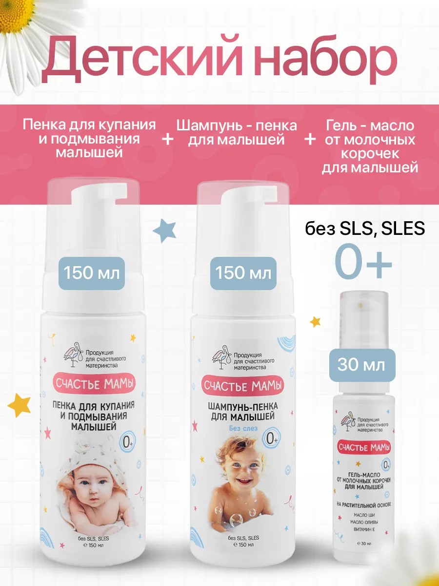 Детский набор 0+ Счастье мамы включает в себя пенку для купания и подмывания малышей, шампунь пенку и гель-масло от молочных корочек. Пенка для подмывания младенцев Счастье мамы - бережно и эффективно ухаживает за нежной кожей, деликатно очищает и успокаивает детскую кожу, не вызывая раздражения, сухости и высыпаний. Шампунь пенка для новорожденных - создана для бережного очищения волос и кожи головы малыша с первых дней жизни и без слез. Подходит и для девочек и для мальчиков. Благодаря растительной моющей основе, состоящей из кокосового масла шампунь для новорожденных бережно очищает волосы и кожу головы без пересушивания, защищает естественный барьер кожи от разрушения и не щиплет глазки малыша. Гель-масло от молочных корочек для малышей Счастье мамы обеспечивает бережный уход за нежной кожей головы младенцев, эффективно устраняя сухие «молочные» корочки. Вместе с детский средством рекомендуем использовать гребешок для новорожденных от корочек. Все средства не содержат не содержит SLS, SLES, парабенов, силиконов и красителей, создана специально для особенно нежной кожи и интимной зоны малыша с рождения.