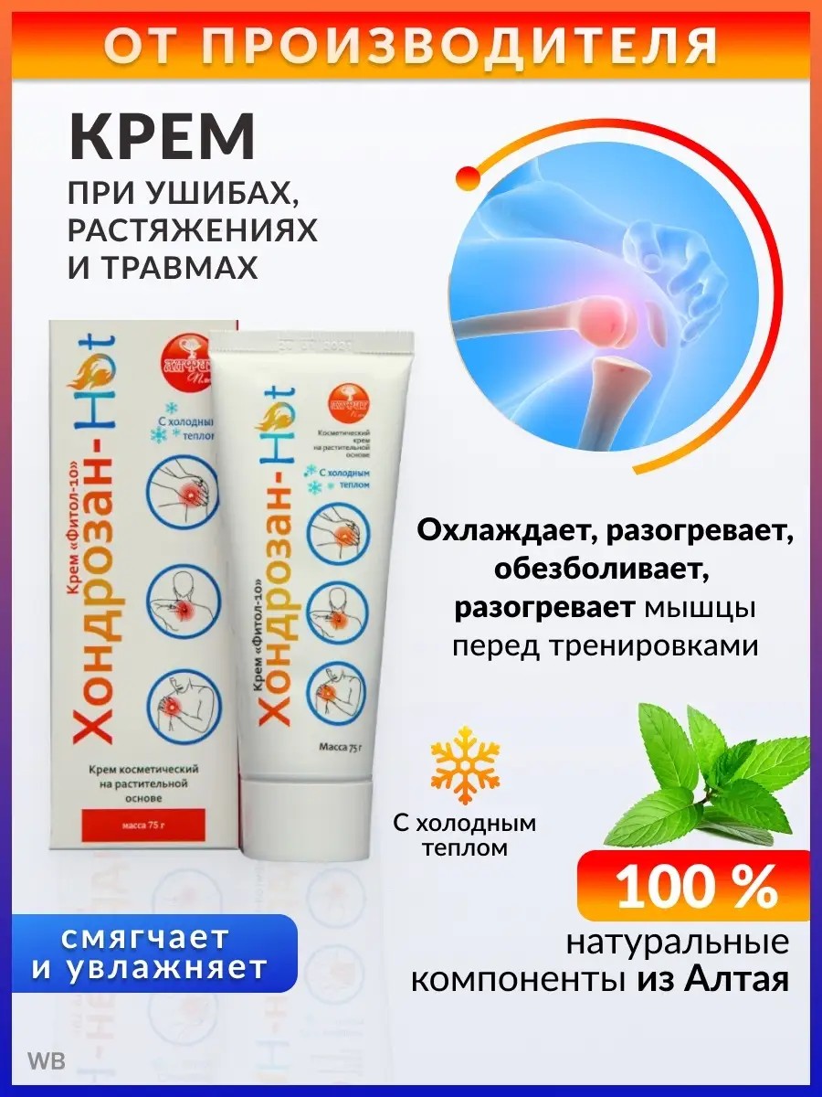 Крем Фитол-10 Хондрозан-Fito крем от остеохондроза артрита артроза изготовлен на основе эфирных масел и водных экстрактов алтайских трав с применением вакуумной технологии. Фитол 10 крем разогревающий согревающий для суставов мышц позвоночника от боли в спине от боли в пояснице в суставах ногах от мышечных болей обезболивающий регенерирующий противовоспалительный массажный с маслами артрит артроз остеохондроз уход за телом мазь гель для суставов для мышц от ушибов оздоровление для спортсменов. Применяется:- при активных физических нагрузках; - для разогрева мышц перед тренировками;- при суставном и мышечном ревматизме, артрите, артрозе, радикулите, остеохондрозе. Компоненты, входящие в состав крема, оказывают смягчающее и увлажняющее действия, способствуют более глубокому проникновению в ткани активных веществ, которые: способствуют улучшению микроциркуляции в суставных тканях, снижению отечности, укреплению мускульных и соединительных тканей, стимулируют тонус и жизнедеятельность тканей оказывают обезболивающее, противовоспалительное, охлаждающе-согревающее действия, хондропротектор рекомендуются для разогрева мышц перед активными тренировками. Фитол 10 крем для тела с маслами обезболивающий регенерирующий противовоспалительный восстановительный представляет собой однородную массу белого цвета с кремовым оттенком и характерным травяным запахом. Изготовлен массажный крем гель для суставов на основе эфирных масел водных экстрактов алтайских трав с применением вакуумной технологии. Оказывает мазь от боли в спине от боли в суставах косметическое и профилактическое действие, стимулирует тонус и жизнедеятельность тканей. Благодаря вводимым растительным экстрактам, крем от ушибов от остеохондроза для мышц укрепляет мускульные и соединительные ткани, активизирует процессы обмена веществ, оказывает противовоспалительное и легкое обезболивающее действие. Травы, входящие в состав, способствуют улучшению микроциркуляции в суставных тканях, рассасыванию отёков.