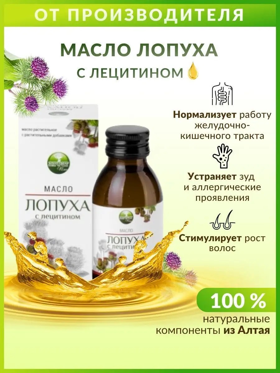 Масло лопуха с лецитином - это растительное масло натуральное с добавками для здоровья и красоты. Используется универсальное масло для приема внутрь как лечебное питание , масло пищевое , а также для наружного применения как масло косметическое при кожных заболеваниях. В составе - масло подсолнечное рафинированное дезодорированное, лопух, лецитин (натуральные биологические пищевые добавки).Лопух обладает желчегонным, мочегонным, противовоспалительным, болеутоляющим, легким слабительным действиями. Способствует выведению из организма шлаков и токсинов, улучшению состояний кожных покровов, очищению желудочно-кишечного тракта, выведению лишний жидкости из организма. Благоприятно воздейтвует масло холодного отжима на женское и мужское здоровье. При внутреннем употреблении в народной медицине применяют при нарушении менструального цикла, нормализует гормональный баланс, при воспалительных процессах желудочно-кишечного тракта, при нарушениях пищеварения, от запоров, при избыточном весе для похудения жиросжигатель, при слабом иммунитете. При наружном применении улучшает состояние кожи, устраняя зуд и аллергические проявления, снимает воспаления, дезинфицирует раны, ожоги, порезы и укусы. В косметологии оказывает регенерирующее воздействие, возвращая коже молодость и красоту, стимулирует рост волос, придавая им силу и блеск. Лецитин способствует улучшению деятельности головного мозга, нормализации уровня холестерина в крови. При употреблении внутрь, бад адаптоген благотворно влияет на деятельность печени, является строительным материалом для клеточных оболочек всего организма. Укрепляет нервную систему, нормализует липидный обмен. Лецитин сильный антиоксидант, способный выводить токсины из организма - очищение организма детокс. При наружном применении лецитин снимает воспаление и раздражение кожи, стимулирует регенерацию клеток, улучшает структуру и предупреждает образование морщин. Являясь антиоксидантом, защищает кожу от отрицательного воздействия свободных радикалов.Подходит масло для детей как детское масло. В косметологии используется наружно как масло крем противовоспалительный защитный тонизирующий от воспаления и морщин, масло для лица кожи для тела массажное увлажняющее, масло для массажа для ванны и душа, увлажнение.СПОСОБ ПРИМЕНЕНИЯ. По 1 чайной ложке 2-3 раза в день за 20 минут до еды или во время приема пищи. Допускается естественный осадок. Перед употреблением взболтать. Продолжительность приема – 1 месяц. При необходимости прием можно повторить.Приятные органолептические свойства масла позволяют применять его для приготовления еды и горячих блюд, заправки салатов и т.д. без определенной дозировки, удачно сочетается в кулинарии с другими растительными маслами (оливковое масло , подсолнечное).Возможно использование в качестве косметического средства - масло косметическое для лица и тела.При дерматологических заболеваниях или травмах кожи масло рекомендуется наносить на поврежденные участки кожи 2 раза в день - утром и вечером (через 10 минут после нанесения остатки масла следует удалить с помощью бумажной салфетки).ПРОТИВОПОКАЗАНИЯ. Возможна индивидуальная непереносимость компонентов.Также у нас Вы сможете найти все для здоровья: масло для кутикулы для бровей ресниц волос, полезные 