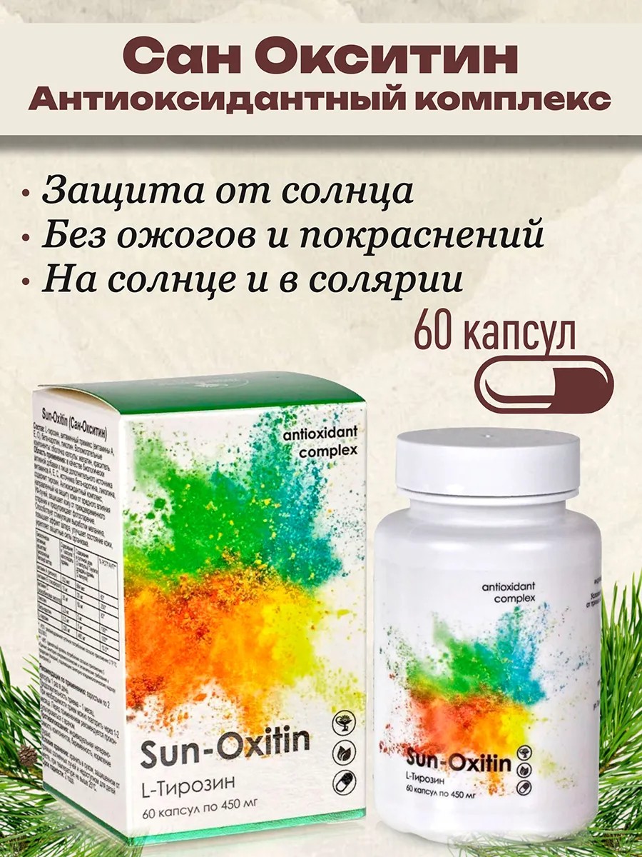 L тирозин нормализует работу эндокринных желез, участвует в синтезе гормонов, в обмене жиров, стимулирует синтез меланина (пигмента кожи и волос), регулирует аппетит. При участии L тирозина происходит выработка гормонов адреналина, норадреналина, дофамина. Эти вещества стимулируют работу мозга, улучшают передачу нервных импульсов, облегчают работу сердца при больших физических нагрузках. Тирозин необходим щитовидной железе для синтеза гормонов, обеспечивающих рост и восстановление тканей, поддержания нормального обмена веществ и психической активности. В целом, восполнение недостатка Л тирозина положительно влияет на весь организм: уменьшаются спазмы сосудов; повышается стрессоустойчивость нервной системы; улучшается работа мозга и его когнитивные функции (память, внимание, способность к обучению и т.д.); укрепляется иммунитет. Антиоксидантный комплекс SunOxitin поможет организму долго сохранять молодость, улучшить состояние кожи при возрастном старении, а также усилить эффект загара, при этом повысив защиту организма от вредных лучей. На заметку Sun Oxitin при курсовом применении поможет усилить и продлить действие лосьона от седины Ниседина – средства для восстановления природного цвета волос. САн окситин - средство для тех, кто хочет получить красивый золотистый загар без ожогов и вреда для кожного покрова.