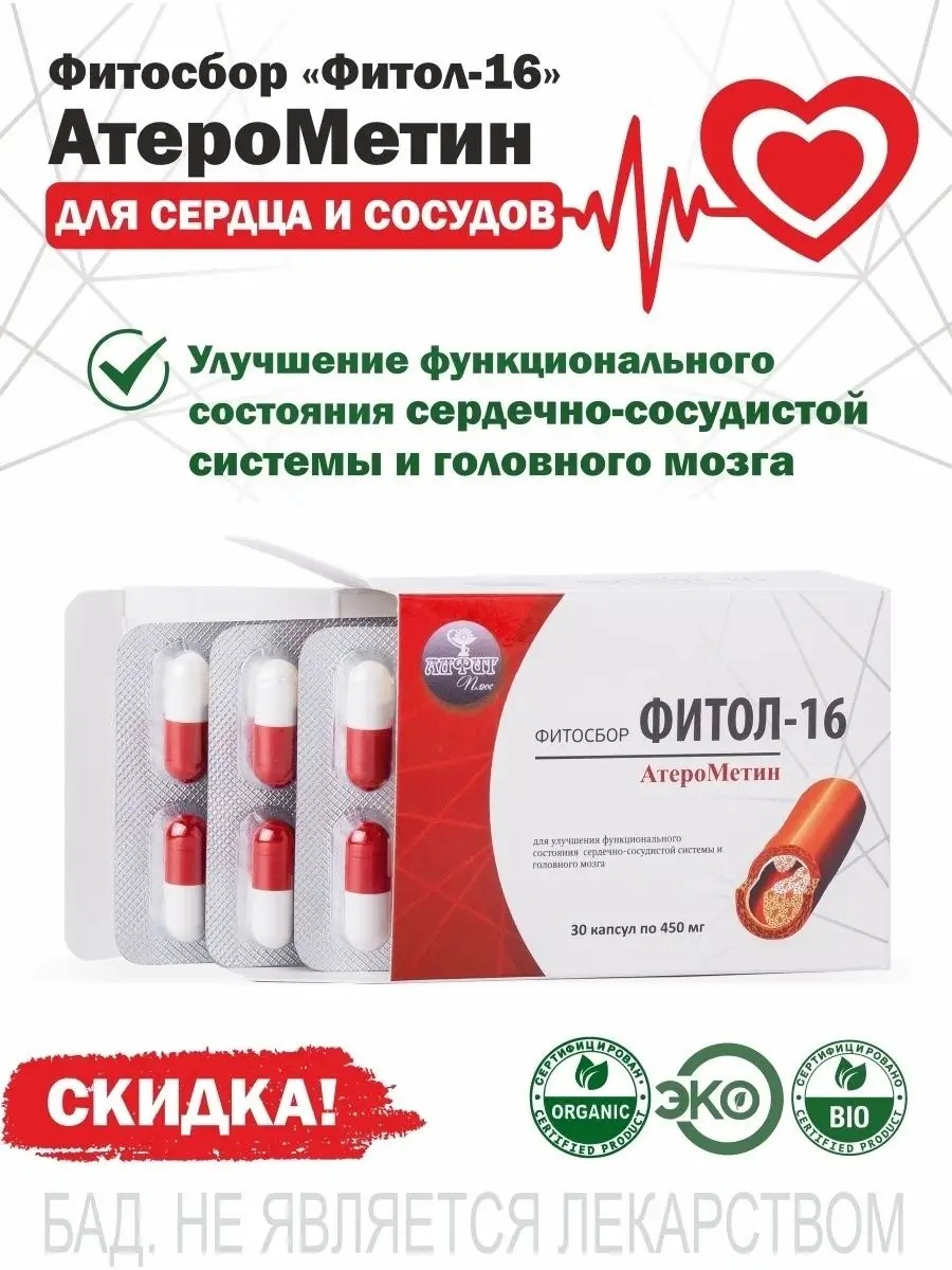 The herbal collection Fitol-16 AteroMetin is a biologically active dietary supplement. It is recommended for improving the functional state of the cardiovascular system and brain. It helps maintain normal blood cholesterol levels and strengthens vascular walls. It is used for atherosclerosis and cardiovascular diseases. It helps reduce symptoms such as dizziness, tinnitus, palpitations, and heart pain. Ingredients: Methionine has a lipotropic effect, preventing fat accumulation in the arteries and liver, lowering blood cholesterol levels, and increasing phospholipid levels. Methionine is not synthesized in the human body, and therefore the only natural way to replenish this amino acid is through a diet containing foods rich in methionine. Omega-3 polyunsaturated fatty acids have pronounced hypolipidemic and anti-atherosclerotic effects, including by reducing cholesterol levels. Long-term intake of these acids helps normalize the ratio of low- and high-density lipoproteins, which slows atherogenesis in blood vessels and helps reduce existing cholesterol plaques. OMEGA-3 PUFAs help prevent the formation of atherosclerotic plaques; lower blood pressure; reduce the risk of thrombosis; reduce the risk of arrhythmia; reduce the risk of myocardial infarction and ischemic stroke; and improve cognitive function (memory and attention). Vitamin C increases lipid metabolism, which has a positive effect on the inner walls of arteries. It reduces blood cholesterol levels. This occurs because ascorbic acid stimulates the release of cholesterol by liver cells into bile and the intestines.
