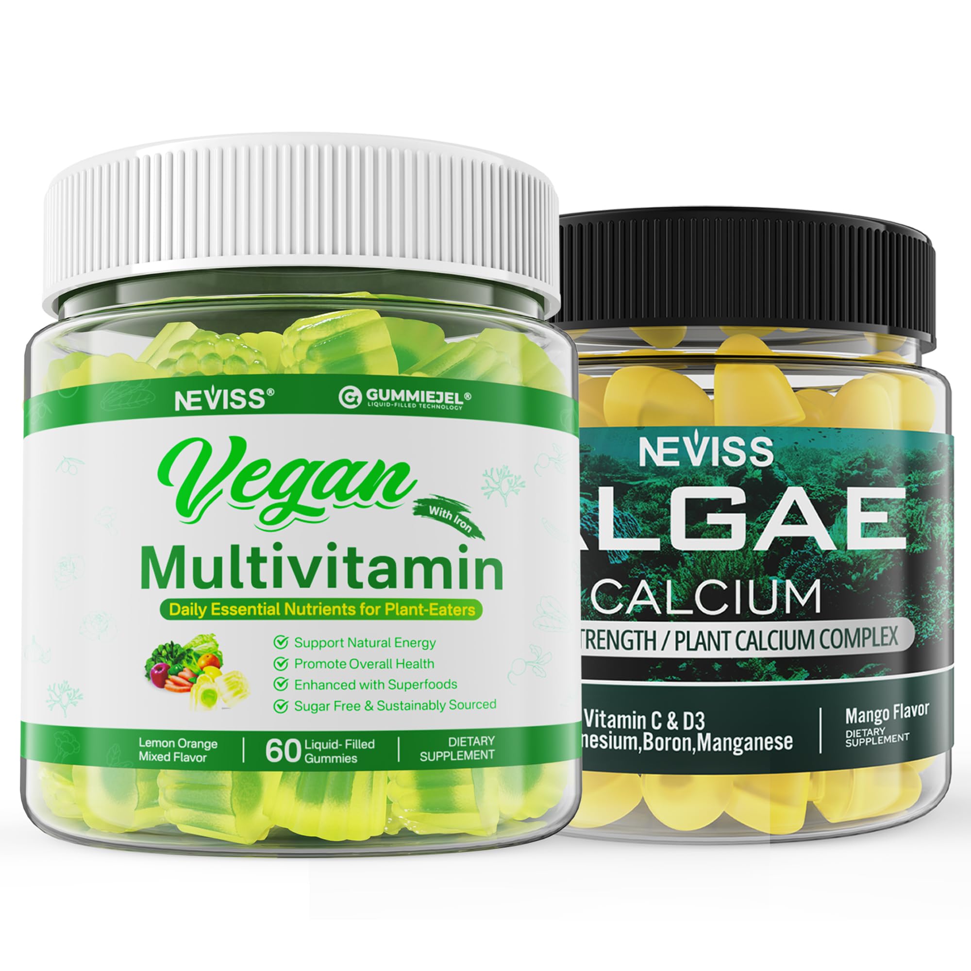 Algae Calcium Gummies 600mg with Vegan Multivitamin for Women Men with Iron Vitamin B12 A D3 K2 Algae Omega 3 Magnesium Zinc