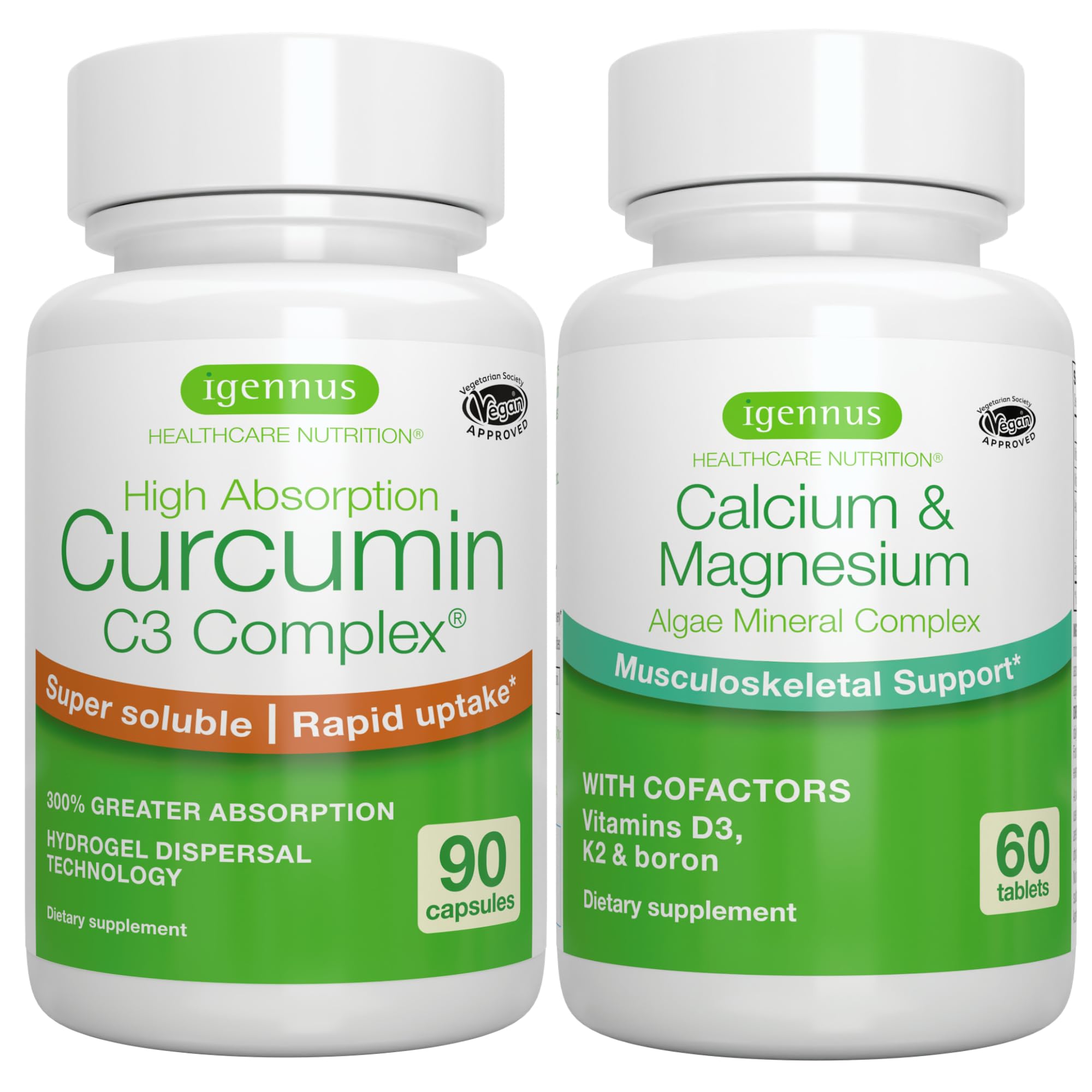 Algae Calcium & Magnesium Complex + High Absorption Curcumin C3 Complex Vegan Bundle for Bones Joints & Recovery from Exercise by Igennus