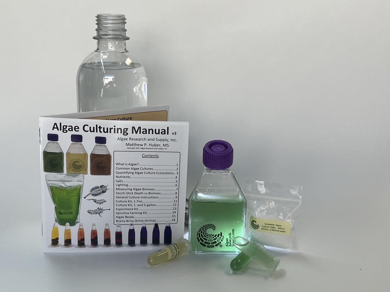 Algae Culture Kit for Microalgae. We have perfected the method and supplies for anyone to grow an ecologically or industrially important strain of algae. It contains everything you need to grow a laboratory-grade culture at home or at your desk! It includes the following: (1) Instructions: information about the strain of algae, illustrated growing protocol, culture care lessons, lifecycle background of batch-culture cycles. (2) Culture flask: tissue culture flask (50 ml volume) with a breathable cap. (3) Culture inoculum: 1ml in a dense culture in a 1.5ml micro-centrifuge tube. (4) Nutrient Fertilizer: our nutrients are a modification of the media formula called f 2 (Guillard and Ryther 1962, Guillard 1975). It uses NaNO3 (sodium nitrate) and NaPO4 (sodium phosphate) as the nitrogen and phosphorus sources. (5) Culturing Salts: Add salts to a 500ml bottle of drinking water (water not included in the kit). Different strains of algae have a preference for their water quality. We have perfected the recipe and include a small bag of salt to make 500ml (1 2 liter) of media. The salts provide a needed carbon source as well as slow the growth of competitive algae strains (weeds). Great for science fair projects!
