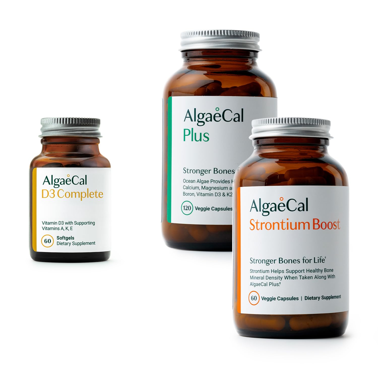 Faster Results: Strontium slows down the cells that eat-away old bone, and speeds-up the cells that build healthy new bone. Which means when taken with AlgaeCal calcium supplement you get stronger bones in 6 months. Traditional calcium citrate supplements with D3 can't make this claim. Increase Bone Density: AlgaeCal Bone Builder Pack, a clinically supported plant-based calcium supplement for increased bone density. Sourced from organic algae with 16 bone-supporting nutrients. In addition to calcium, each serving includes magnesium, potassium, boron, manganese, vanadium, phosphorus, copper, zinc, nickel, strontium, silicon, and selenium - with added Vitamin D3, Vitamin C, and Vitamin K2-7. Don't worry, even though some of these are in D3 Complete - it's good to have extra. Vitamin K: Features a 1000 mcg dose, inclusive of Vitamin K2-4 K2-7, fortifying bone, arterial, and brain health. Uniquely combines all three essential forms – K1, K2-7 and K2-4 - surpassing traditional Vitamin ADEK supplements. Vitamin A E: Delivers Vitamin A to support a youthful appearance and a robust immunity. Also boasts superior Vitamin E (Mixed Tocotrienols from the annatto plant) to offer antioxidant support to your skin, bones, and immune system. Vitamin D3: Unlike standard vitamin D supplements, D3 Complete harmonizes 1000 IUs of Vitamin D with its essential counterparts: Vitamins A, E, K. When taken together these 4 nutrients are greater than the sum of their parts. Supports optimal bone health, robust immunity, cardiovascular well-being, and the maintenance of radiant skin, nails and hair.