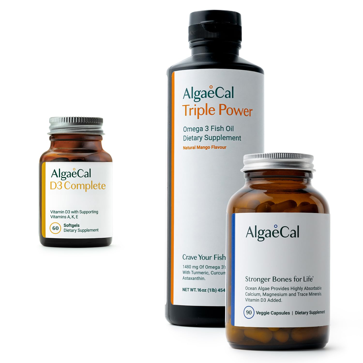 Pure Omega-3: Essential for a healthy life, the fatty acids EPA DHA in fish oil support heart, eye, joint, brain, skin and bone health. Omega-3s also enhance focus, mood, overall well-being and help skin stay hydrated. Triple Power Omega-3 Fish Oil is 300 more powerful than standard Omega-3s. It's also loaded with two of nature's most potent antioxidants. Promotes Healthy Bones: AlgaeCal, a clinically supported plant-based calcium supplement for bone health. Sourced from organic algae with 13 bone-supporting minerals. In addition to calcium, each serving includes magnesium, potassium, boron, manganese, vanadium, phosphorus, copper, zinc, nickel, strontium, silicon, and selenium - also with extra Vitamin D3. Vitamin K: Features a 1000 mcg dose, inclusive of Vitamin K2-4 K2-7, fortifying bone, arterial, and brain health. Uniquely combines all three essential forms – K1, K2-7 and K2-4 - surpassing traditional Vitamin ADEK supplements. Vitamin A E: Delivers Vitamin A to support a youthful appearance and a robust immunity. Also boasts superior Vitamin E (Mixed Tocotrienols from the annatto plant) to offer antioxidant support to your skin, bones, and immune system. Vitamin D3: Unlike standard vitamin D supplements, D3 Complete harmonizes 1000 IUs of Vitamin D with its essential counterparts: Vitamins A, E, K. When taken together these 4 nutrients are greater than the sum of their parts. Supports optimal bone health, robust immunity, cardiovascular well-being, and the maintenance of radiant skin, nails and hair.