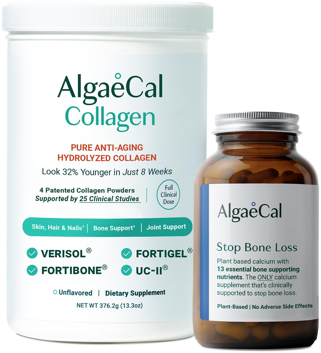 ALGAECAL Calcium & Collagen Bundle Hydrolyzed Collagen Complete with Clinically-Supported Verisol Fortibone & Fortigel Plus 13 Bone Supporting Minerals and Vitamin D3 for Bone Health & Anti-Aging