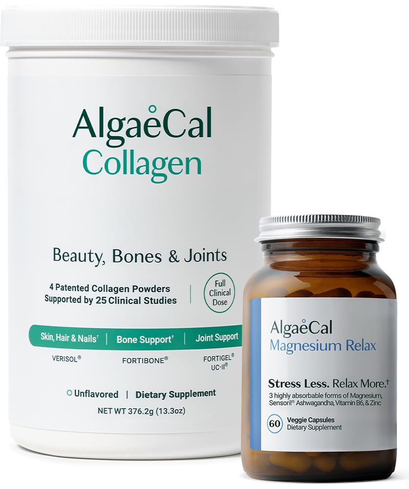 AlgaeCal Magnesium Relax is a magnesium supplement for sleep and stress support. It contains TRAACS Magnesium Bisglycinate Chelate, magnesium bisglycinate, magnesium citrate, and magnesium malate as Albion Dimagnesium Malate capsules, also known as glicinato de magnesio and malato de magnesio. These forms are gentle on digestion and highly bioavailable. This chelated magnesium formula also includes Sensoril ashwagandha, zinc, and p5p vitamin b6 (active B6) to support sleep, occasional nervousness, and stress management. Magnesium Relax is ideal for those looking for magnesium bisglycinate capsules or magnesium glycinate supplements. It provides functional support without melatonin. AlgaeCal Collagen: Unlock the secret to a younger, healthier you with AlgaeCal Collagen, the groundbreaking, pure collagen powder that stands out with its scientifically backed ingredients and impressive results. Supported by 109 PhDs and 25 clinical studies, this amazing, anti-aging supplement is your daily dose of rejuvenation for bones, joints, hair, skin and nails. Achieve visibly firmer and smoother skin with Verisol collagen. Our anti-aging multi-collagen powder is also a great collagen for joints and knees. Fortigel collagen has been shown to regrow knee cartilage within 6 months, significantly reducing aches and improving mobility. Fortibone's multi-collagen peptides support your skeletal system, increg bone density and reducing the risk of fractures. Our unflavored collagen powder mixes effortlessly into your morning coffee or smoothie.AlgaeCal Collagen: Feel Younger: In clinical studies UC-II reduced joint aches in as little as 12 weeks. And FORTIGEL has been shown to increase the thickness of cartilage tissue-making joints feel more comfortable. AlgaeCal Collagen: Look Younger: Clinical studies with VERISOL show a 32 reduction in eye wrinkles within just eight weeks, making skin appear more youthful and radiant. AlgaeCal Magnesium Relax: For the Stress You Don't Talk About: Whether it's a short fuse, 3 a.m. wakeups, or constant overwhelm — this magnesium for sleep and occasional nervousness was built to gently dial it down. And help you feel good again. AlgaeCal Magnesium Relax: Finally Sleep Through the Night: Magnesium Relax combines magnesium bisglycinate, citrate, and malate with Sensoril ashwagandha to help your body unwind — so you can fall asleep faster and wake up feeling like yourself again. AlgaeCal Magnesium Relax: Feel Calm, Even When Life Isn't: This calm magnesium blend was made for the person juggling work, family, and everything in between. You'll feel centered, even when your day gets chaotic.