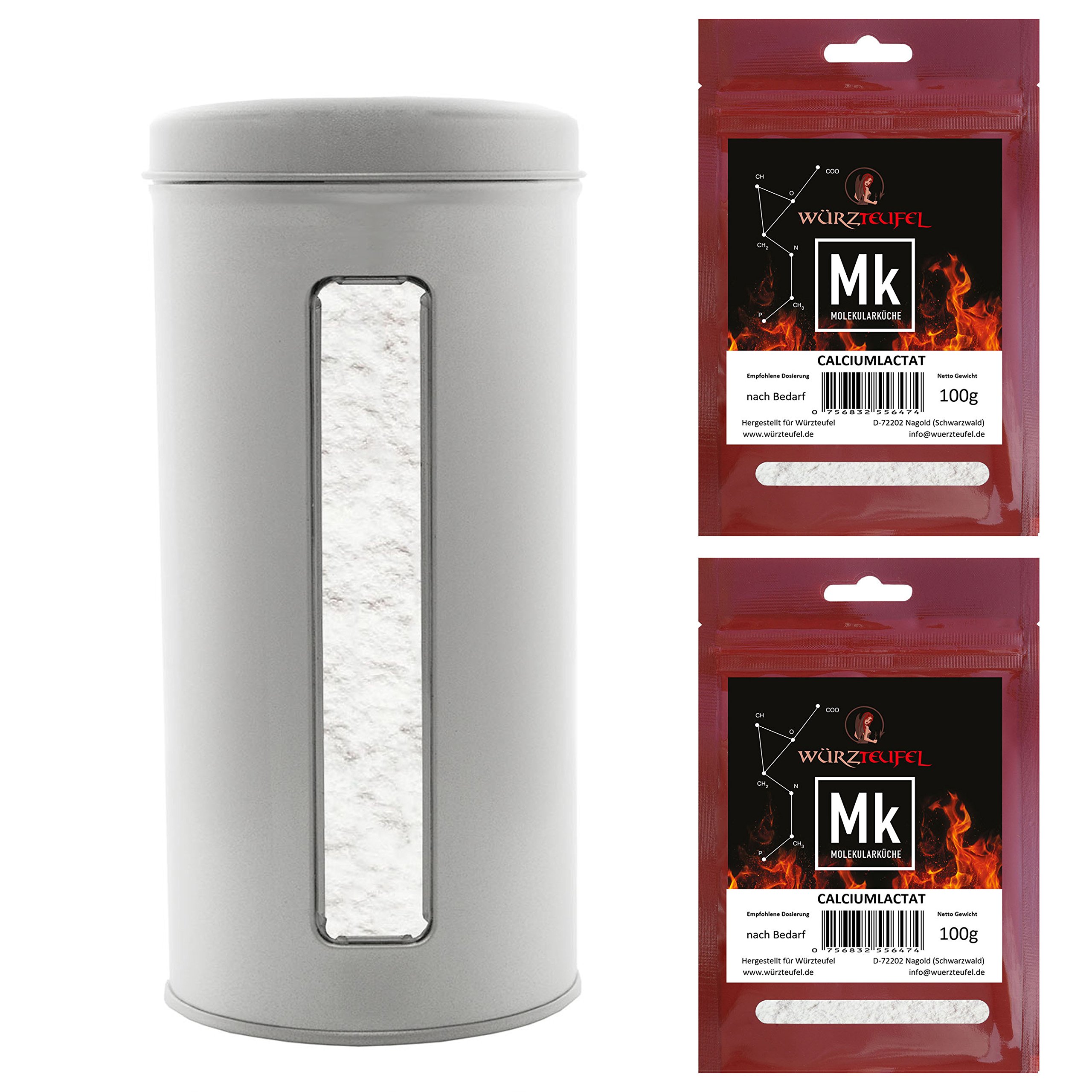 : Natural Alginate. Alginate is a polysaccharide obtained from brown algae. It has the designation E 401 and is used as a gelling agent. This polysaccharide develops very strong lubricating properties when combined with calcium chloride. The combination of the two products results in an elastic, temperature-resistant gel. Sodium alginate is probably the most important polysaccharide in molecular gastronomy. The powder forms a very pleasant gel, both soft and firm, and is the main ingredient in the production of fruit caviar. Calcium Lactate. Calcium lactate is a pure, crystalline calcium salt of lactic acid, which is naturally present in all living cells. Due to the rapid reaction of existing calcium ions, calcium salt acts as a catalyst for a wide variety of chemical and biological processes, notably those involved in the production of various molecular gastronomy products. For example, calcium lactate allows sodium alginate to slowly solidify, creating a firm and elastic structure with synergistic stabilizing properties, or it enhances the functions of pectins in jellies, jams, and spreads. Safety Warning: Not suitable for direct consumption. Keep out of reach of children. Hygroscopic productFree shipping in Germany for orders over €30, European Union: over €50. Sodium alginate packaging: practical, decorative, and refillable - Metal tin. Filling weight: 400 g. Calcium lactate: 2 high-quality polyethylene sachets with a window and aroma-preventing protective layer - Weight: 100 g. Easy to open and dispense, resealable with a snap closure. Our quality standards for your safety: ISO 9001, IQ-NET, HACCP, HALAL, DUALES SYSTEM Germany. After use, both products must be sealed or hermetically closed immediately otherwise, their quality may be compromised due to their strong hydroscopic effect (water absorption). Calcium lactate is completely pH neutral, allergen-free, and approved for use in all organic products. Thanks to its exceptionally fine particle size (less than 20 mesh), the mineral dissolves easily in both hot and cold aqueous solutions. Pure and highly purified sodium alginate 400-600 cps – the basic material for making fruit caviar, bubble tea bags, fruit chocolates and much more.Description du produit alginate naturel. L'alginate est un polysaccharide obtenu à partir d'algue marron. Il porte la désignation E 401 et est utilisé comme agent gélifiant. Ce polysaccharide développe de très fortes propriétés lubrifiantes dès qu'il avec du chlorure de calcium. Grâce à la combinaison des deux produits, des Les structures d'algine se combinent aux ions calcium. Le résultat est un gel élastique et résistant à la température. L'alginate de sodium est probablement le polysaccharide le plus important de la cuisine moléculaire. La poudre forme Un gel très agréable, à la fois doux mais ferme, c'est le matériau principal de la production. de caviar de fruits. ________________________________________________________________________________________________________ Calciumlactate. Le lactate de calcium est un sel de calcium pur et cristallin de l'acide lactique qui est naturellement présent dans toutes les cellules vivantes. incluse. En raison d'une réaction rapide des ions de calcium existants, le sel de calcium est une espèce Catalyseur pour une grande variété de processus chimiques et biologiques, qui sont notamment impliqués dans la la production de différents produits de la cuisine moléculaire. Ainsi, le lactate de calcium laisse par exemple geler lentement l'alginate de sodium, une structure ferme et élastique avec des propriétés de stabilisation des synergies. ou renforce les fonctions des pectines en gelées, confitures et pâtes à tartiner. Avertissement De Sûreté Ne convient pas à la consommation directe. Tenir hors de portée des enfants. Produit hygroscopiqueLivraison gratuite en Allemagne à partir de 30 euros, Union européenne : à partir de 50 euros. Emballage alginate de sodium : pratique, décoratif et rechargeable - Boîte en métal. Poids du rembourrage : 400 g. Lactate de calcium : 2 sachets en polyéthylène de qualité supérieure avec fenêtre et couche protectrice d'arômes - Poids : 100 g. Facile à ouvrir et à doser, refermable avec fermeture à pression. Nos normes de qualité pour votre sécurité : ISO 9001, IQ-NET, HACCP, HALAL, DUALES SYSTEM Allemagne. Après utilisation, les deux produits doivent être scellés ou fermés immédiatement de manière hermétique, sinon la qualité des deux produits pourrait souffrir de leur fort effet hydroscopique (absorption de l'eau). Le lactate de calcium est entièrement au pH neutre, exempt de tout allergène et son utilisation est homologuée pour tous les produits BIO. Grâce à sa taille particulièrement fine (moins de 20 mesh) le minéral est particulièrement facile à dissoudre dans les milieux aqueux chauds et froids. Alginate de sodium pur et hautement purifié 400-600 cps – le matériau de base pour la fabrication de caviar de fruits, de sachets de thé à bulles, de chocolats aux fruits et bien plus encore.Alginate de sodium et lactate de calcium - Pour la cuisine - Avec caviar moléculaire - Fabrication facile - Boîte d'alginate de sodium 400 g et 2 sachets de lactate de calcium de 100 g chacun.