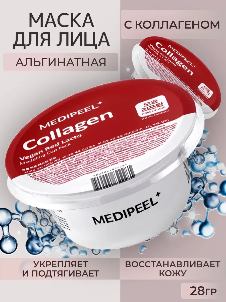 Восстанавливающая альгинатная маска для лица с коллагеном MEDI-PEEL Vegan Red Lacto Collagen Modeling Cup Pack укрепляет и подтягивает кожу, разглаживает рельеф, успокаивает покраснение, выравнивает тон и придаёт здоровое сияние.