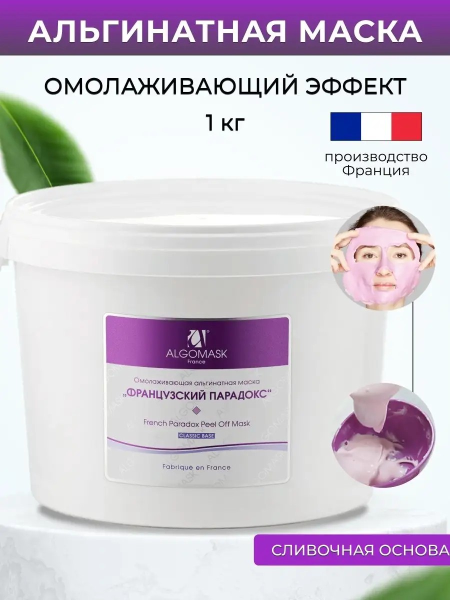 Альгинатная маска 1 кг профессиональная для лица ФРАНЦУЗСКИЙ ПАРАДОКС Algomask с моментальным омолаживающим действием уже после 1 го применения. Мякоть винограда сильный антиоксидант, омолаживает, моментально преображает кожу, стимулирует регенерацию клеток, увлажняет и питает. Эффективна в борьбе со старением кожи. Улучшает синтез коллагена, восстанавливает структуру кожи. Борется с воспалением и раздражением, укрепляет сосуды, снижает уровень токсинов в коже. Защищает эпидермис от ультрафиолета и преждевременного старения. Маска моментально преображает кожу, делает ее упругой, и сияющей. Преимущество Algomask в качестве альгината. Высокий % ввода активных компонентов и гарантированный результат, заслужил высокий рейтинг у косметологов за 20-летний опыт использования в салонных процедурах. Маски фиксируют контуры лица и тела, после чего снимаются одним пластом, а не кусками, только при таких свойствах альгината создается лифтинг эффект. При застывании образуется воздухонепроницаемая пленка, препятствуя испарению влаги. Активные ингредиенты удерживаются под слоем. Усиливают действия сывороток, наносимых под маску глубоко проникая в эпидермис. Маска косметическая легко разводится и не вызывает аллергических реакций, гипоаллергенна. Для разведения рекомендуем сыворотку активатор Womans bliss вместо воды, результат будет эффективнее и ярче. Подходит для нанесения на область зоны глаз и век, декольте и шеи. Устраняют сухость, шелушение и раздражение, борется с возрастными изменениями. Стимулируют выработку collagen, эластина, повышает упругость и эластичность кожи. Делают кожу нежной, мягкой, матовой и сияющей. Выраженный подтягивающий и омолаживающий эффект. Algomask представлены в большом ассортименте: с пептидами, против пигментных пятен. Жирной кожи с акне, прыщами. Чувствительной кожи и с куперозом, розацеа. Professional маску используют после аппаратных или узи чистки. кг. Качество французской косметики превосходит корейские Корея средства. Подарок на 8 марта