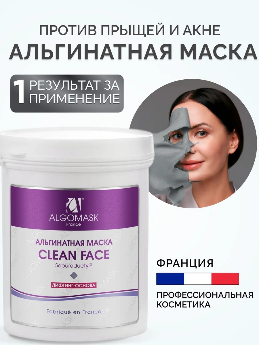 Альгинатная маска для лица "CLEAN FACE" профессиональная Algomask с моментальным омолаживающим действием уже после 1 го применения. Содержащит экстракты дрожжей и лиственничной губки, витамины группы B (пиридоксин, биотин, ниацинамид, и D-пантенол) и аллантоин, очищает и сужает поры, улучшает гидратацию кожи, устраняет застойные красные пятна. Маска предназначена для жирной, комбинированной кожи с акне, угревой сыпью, уменьшает гиперсекрецию кожного сала, снимает воспаление.