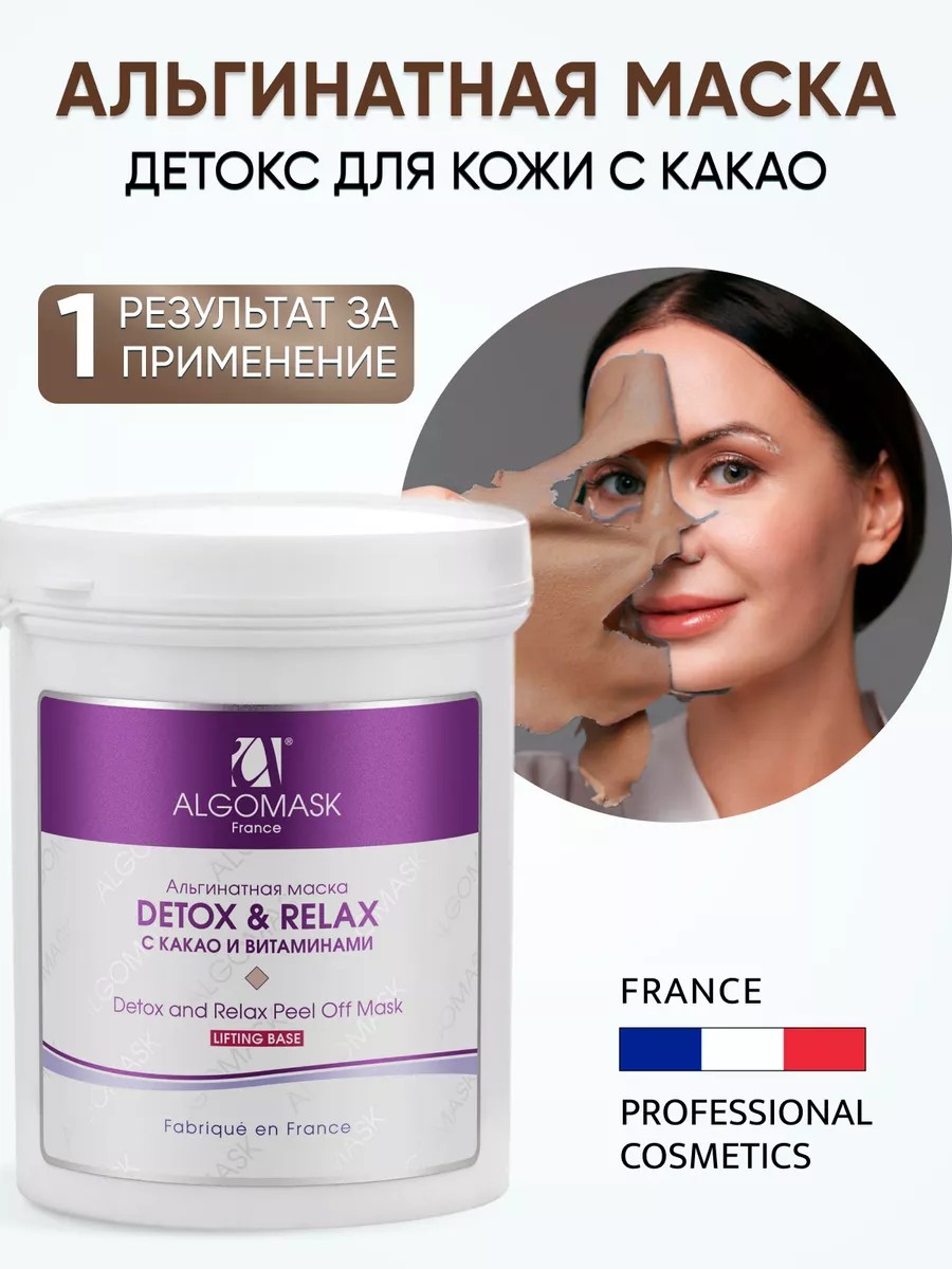Альгинатная маска профессиональная для лица DETOX & RELAX Algomask с моментальным омолаживающим действием после 1-го применения. Увлажняет и питает, способствует сокращению морщин. Насыщена антиоксидантными компонентами, поддерживает тонус кожи, усиливает защитные функции. Обладает сильным лифтинг эффектом. Какао смягчает кожу, обладает antiage-свойствами. Бета-каротин защищает от преждевременного старения. Витамин Е разглаживает кожу, помогает снять раздражение. Является профилактикой появления пигментных пятен. Витамин С формирует коллагена и эластина, укрепляет сосуды.