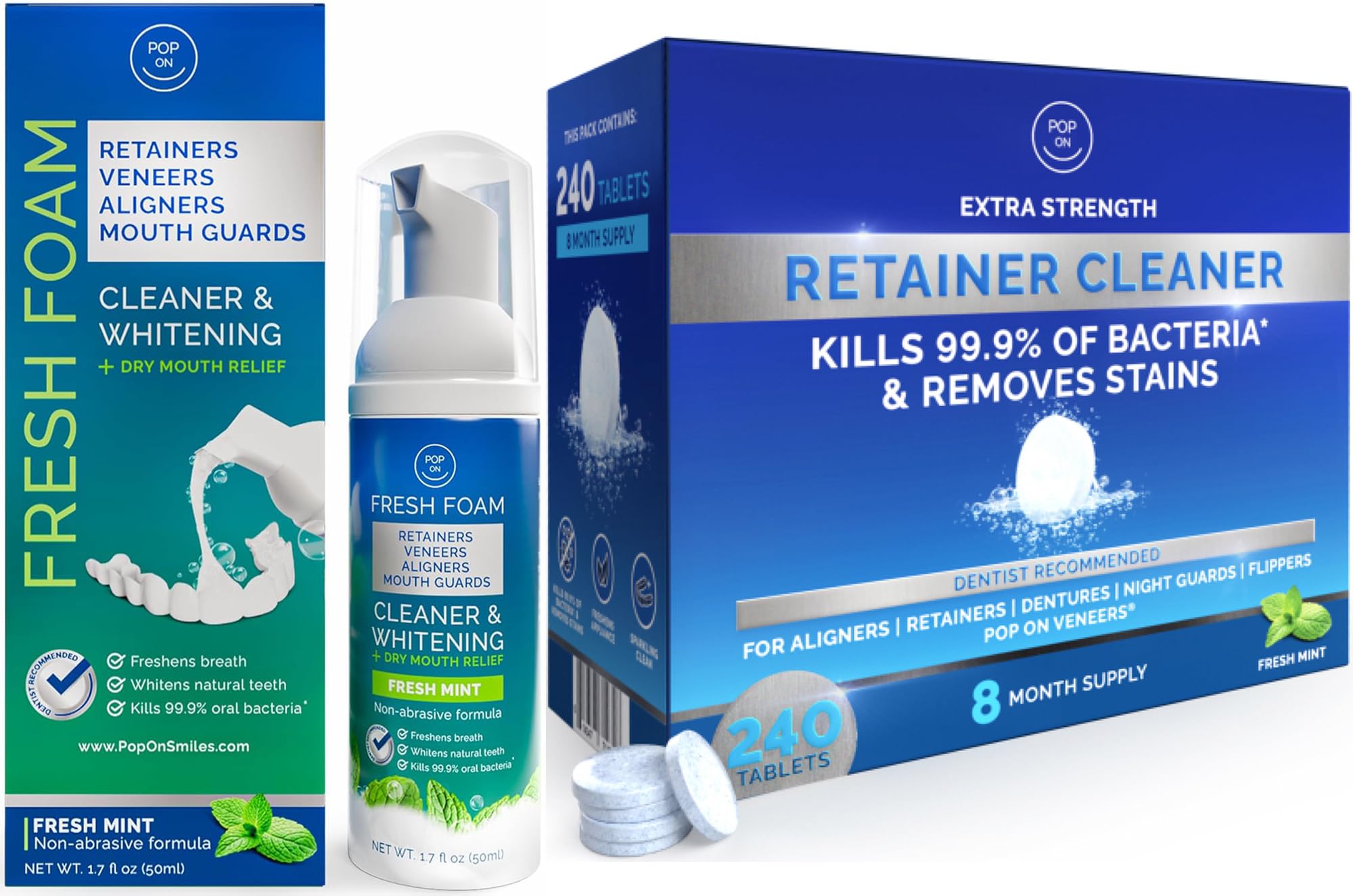 4-MONTH SUPPLY TRAVEL-READY FOAM – Includes 120 individually wrapped dental tablets for everyday deep cleaning and a portable bottle of retainer cleaning foam—perfect for travel, office, or gym. Stay confident and fresh with the ultimate bundle for your dental appliances. SAFE FOR ALL APPLIANCES, LOVED BY DENTISTS – This dual-care bundle is bleach-free, non-abrasive, and dentist recommended. Safe for daily use on Invisalign aligners, night guards, mouth guards, dentures, veneers, and Pop On Veneers. Ideal for maintaining dental hygiene at home or on the go. KILLS 99.9 OF BACTERIA GENTLE TEETH WHITENING – Our cleaning tablets eliminate plaque and bacteria that cause bad breath, while the aligner whitening foam with 3 hydrogen peroxide gently whitens teeth under your appliance without sensitivity—so your smile stays fresh, healthy, and bright. ? FAST POWERFUL CLEANING, ANYTIME, ANYWHERE – Use the extra strength retainer cleaning tablets in your dental pod or ultrasonic retainer cleaner for powerful cleansing in just 5 minutes. On-the-go? Grab the quick-dissolve whitening foam for fast, mess-free freshness and odor elimination—no brushing or rinsing needed. ✓ COMPLETE ORAL APPLIANCE CLEANING KIT, TABLETS FOAM COMBO – Get the best of both worlds: deep-cleaning retainer cleaner tablets for ultrasonic machines and on-the-go aligner cleaner fresh foam. Perfect for Invisalign, retainers, mouthguards, dentures, and more—this bundle delivers professional-level hygiene, clarity, and convenience.