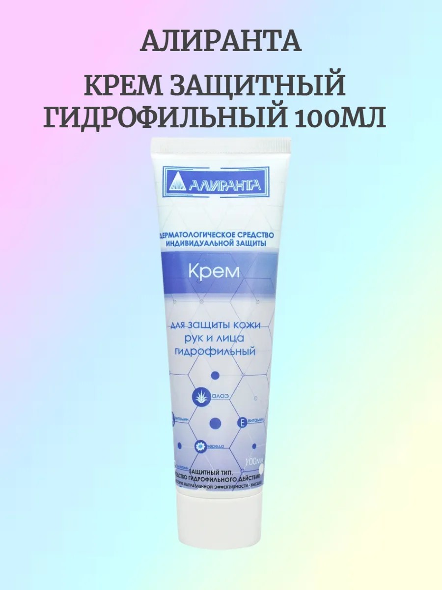 Крем защитный гидрофильный 100мл Алиранта. Назначение: крем защищает кожу рук и лица, а также другие открытые части тела от нерастворимых в воде соединений: органических растворителей, нефтепродуктов, масел, смазок, сажи, лаков, красок, смол, металлических порошков, химикатов, смол, земли, производственной пыли ( металлической, угольной, бумажной, стекольной), мазута, стекловолокна, извести, цемента и др. Область применения: применяется в машиностроительных, химических и других производствах, при ремонте машин и оборудования, а также в быту. Свойства: защищает кожу в течение 4-х часов и более. Облегчает очистку кожи после работы. Быстро впитывается и не оставляет жирных следов и ощущения липкости. Витамины А и Е являются уникальными природными соединениями, которые оказывают антиоксидантное, омолаживающее и противовоспалительное воздействие на кожу. Благодаря содержанию в креме экстракта череды, экстракта алоэ средство подходит для чувствительной и раздраженной кожи рук и лица. Рекомендации по применению: 1. небольшое количество крема нанести на чистые и сухие руки и лицо, а также на другие открытые участки тела, равномерно распределить на коже; 2. после высыхания крема и образования пленки можно начинать работать; 3. по окончании работ вымыть кожу с мылом; 4. после работ рекомендуется использовать крем для кожи рук и лица восстанавливающий (регенерирующий). Расход средства на одно применение 0.5-1мл. Меры предосторожности: при попадании на слизистую оболочку глаз — обильно промыть водой.Упаковка: пластиковые тубы 100 мл. Условия хранения: хранить в темном прохладном месте при температуре от 0 до +30°С. Гарантийный срок хранения: 36 месяцев со дня изготовления, 12 месяцев после вскрытия упаковки. Объем — 100 мл. Соответствует стандартам ГОСТ 31460-2012, ГОСТ Р 12.4.301-2018, ТР ТС 019/2011.