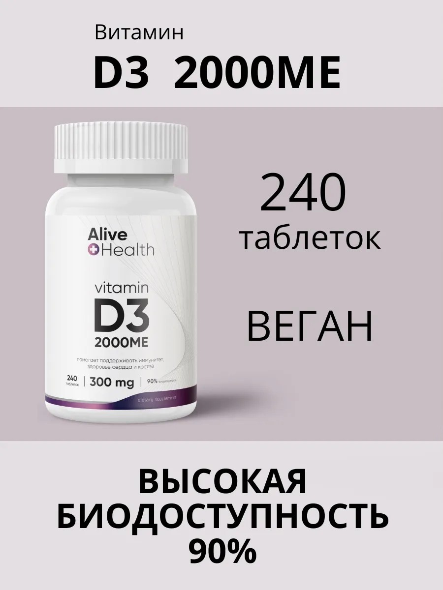 Витамин Д3 2000 от Alive Health - это высококачественный источник витамина Д3 в таблетках, который содержит 2000 МЕ в одной таблетке, что соответствует рекомендованной дневной норме для взрослых. Витамин д3, также известный как холекальциферол, играет важную роль в многих процессах в организме, включая иммунную защиту, здоровье костей и зубов, рост и развитие мышечных клеток, нормализацию уровня глюкозы в крови и рост и развитие нервных клеток. Дефицит витамина Д3 является распространенной проблемой, особенно в странах с облачным климатом и длинной зимой. Низкий уровень витамина D в организме связан с риском развития сердечно-сосудистых и неврологических заболеваний, бессонницы, ухудшения памяти и других симптомов. Поэтому контроль уровня витамина D3 в крови и прием соответствующих добавок важен для поддержания здоровья. Этот продукт представляет собой безопасный и эффективный способ повысить уровень витамина солнца в организме. Витамин D3 – это биодоступная форма витамина д3, которая быстро и легко усваивается организмом, подходят как для мужчин, так и для женщин и детей от 14 лет. Этот продукт может быть полезен для тех, кто стремится похудеть, так как витамин Д3, содержащийся в более высокой дозировке, помогает лучше регулировать уровень инсулина в организме и уменьшать аппетит, что способствует снижению веса. Это идеальный выбор для тех, кто хочет контролировать уровень витамина Д в своей крови и поддерживать здоровье своего организма. Не забывайте, что здоровый образ жизни, правильное питание и умеренные физические нагрузки также являются важными компонентами поддержания здоровья.