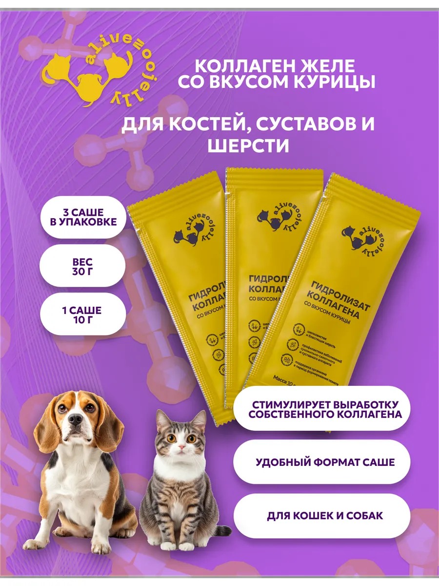 AliveZooJelly - коллаген для животных собак и кошек со вкусом курицы в виде лакомства-желе. Полезный и натуральный продукт для Ваших любимцев, созданный с заботой о их здоровье и благополучии. Хондопротекторы для суставов и связок крайне необходимы не только для мелких, но и для крупных пород собак. Комплекс для суставов и связок представлен в виде саше по 10 грамм каждое, что обеспечивает удобство использования и хранения. Он обогащен мультивитаминным составом: AliveZooJelly содержит коллаген, который является важным компонентом для здоровья суставов и кожи вашего питомца. Основной составляющий компонент способствует эффективному развитию медленно растущих сухожилий и связок у щенков, котят, а у взрослых собак и кошек поддерживает метаболизм суставных хрящей. Также он помогает более быстрому восстановлению связочных и сухожильных тканей, обеспечивая комфортную подвижность Вашего питомца. Стимулирует повышение уровня энергии и улучшению состояния шерсти и кожи животного.