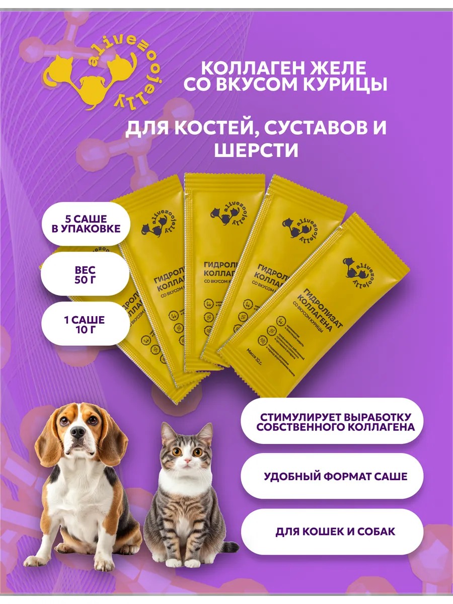 AliveZooJelly - коллаген для животных собак и кошек со вкусом курицы в виде лакомства-желе. Полезный и натуральный продукт для Ваших любимцев, созданный с заботой о их здоровье и благополучии. Хондопротекторы для суставов и связок крайне необходимы не только для мелких, но и для крупных пород собак. Комплекс для суставов и связок представлен в виде саше по 10 грамм каждое, что обеспечивает удобство использования и хранения. Он обогащен мультивитаминным составом: AliveZooJelly содержит коллаген, который является важным компонентом для здоровья суставов и кожи вашего питомца. Основной составляющий компонент способствует эффективному развитию медленно растущих сухожилий и связок у щенков, котят, а у взрослых собак и кошек поддерживает метаболизм суставных хрящей. Также он помогает более быстрому восстановлению связочных и сухожильных тканей, обеспечивая комфортную подвижность Вашего питомца. Стимулирует повышение уровня энергии и улучшению состояния шерсти и кожи животного.