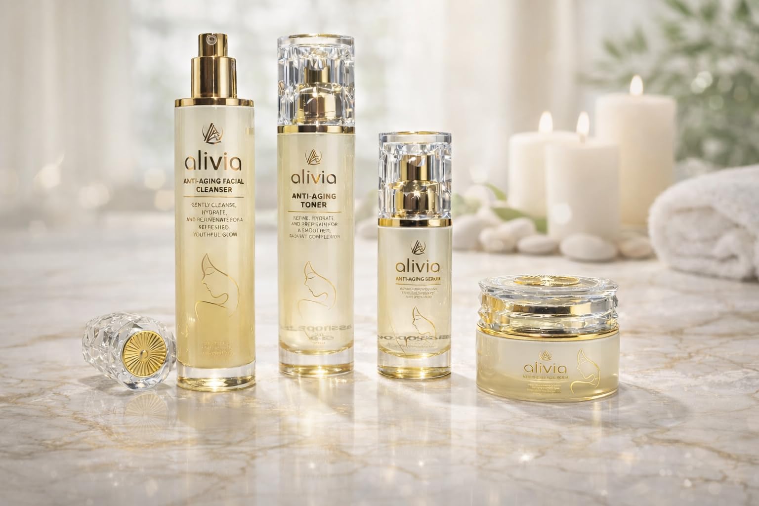 Skincare Set includes: (1) Anti-Aging Facial Cleanser 4.05 oz, (1) Anti-Aging Toner 3.38 oz, (1) Anti-Aging Serum 1.7 oz, (1) Anti-Aging Face Cream 1.7 oz. The alivia Anti-Aging Skincare Set is your complete solution for achieving radiant, youthful-looking skin. This comprehensive four-piece collection includes an Anti-Aging Cleanser, Toner, Serum, and Face Cream, each expertly formulated to work in harmony for maximum results. Enriched with powerful ingredients like Vitamin E, Squalane, Rosehip Oil, and Niacinamide, this set deeply nourishes while targeting fine lines, uneven texture, and dullness. Begin your routine by cleansing away impurities, follow with toner to prep your skin, apply the concentrated serum with peptides to address signs of aging, and seal it all in with the hydrating face cream. Each step builds upon the last, creating a synergistic effect that helps restore your skin's natural glow and vitality. Whether you're just starting your anti-aging journey or looking to enhance your existing routine, this thoughtfully curated set delivers visible, lasting results that help you look and feel your best every day.QUALITY SKINCARE INNOVATION: Curated with trusted, high-quality ingredients to empower your daily beauty routine and elevate your skincare regimen with professional-grade formulations. HARMONIOUS FORMULA: Each product is designed to complement the others, creating a synergistic effect that delivers visible, lasting results for radiant, youthful-looking skin. STEP-BY-STEP APPLICATION: Begin with the cleanser to remove impurities, follow with toner to prep skin, apply serum with peptides for targeted treatment, and finish with moisturizer to lock in hydration and active ingredients. POWERFUL ACTIVE INGREDIENTS: Expertly formulated with Vitamin E, Squalane, Rosehip Oil, and Niacinamide to deeply nourish, rejuvenate, and protect your skin from visible signs of aging. COMPLETE 4-STEP ROUTINE: This comprehensive anti-aging set includes a cleanser, toner, serum, and face cream that work together to target fine lines, improve skin texture, and restore your natural radiance.