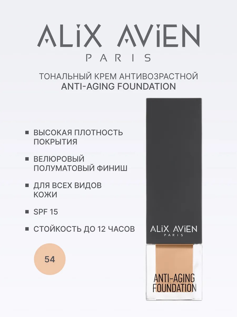 Тональный крем антивозрастной Anti-Aging Foundation в оттенке 54 чистый бежевый, нейтральный оттенок для средне-смуглой кожи. Тональный крем со специальной уходовой формулой против признаков старения от Alix Avien Paris. Имеет фактор защиты от солнца SPF15, подходит для всех типов кожи.