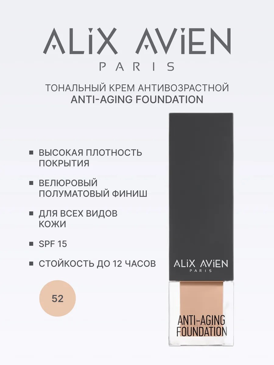 Тональный крем антивозрастной Anti-Aging Foundation в оттенке 52 ванильный теплый, нейтральный оттенок для светлой кожи. Тональный крем со специальной уходовой формулой против признаков старения от Alix Avien Paris. Имеет фактор защиты от солнца SPF15, подходит для всех типов кожи.