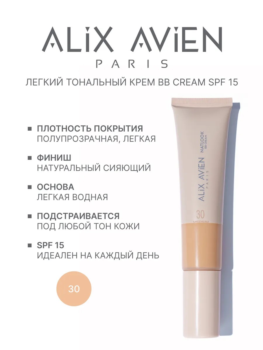 Тональный крем ВВ cream от Alix Avien Paris в оттенке 30 MEDIUM - теплый бежевый для средних оттенков кожи. ББ крем подарит вам ровный, безупречный тон при макияже лица без необходимости интенсивного нанесения продукта. Фактор УФ защиты SPF 15.