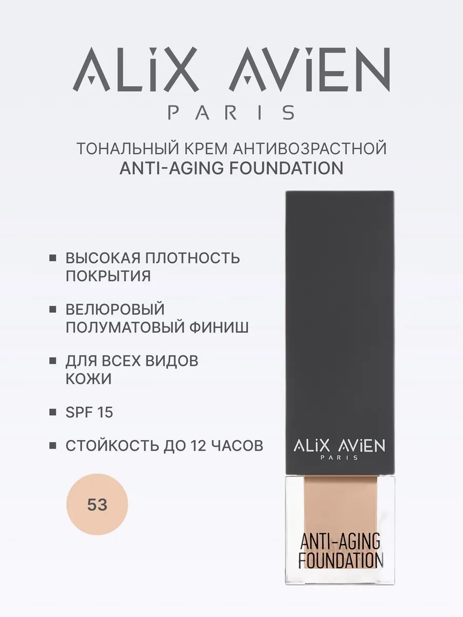 Тональный крем антивозрастной ALIX AVIEN с эффектом Anti-Aging Foundation в оттенке 53 Light Almondминдальный, оливковый, холодный оттенок для средней кожи,создан для идеального макияжа лица и ухода за кожей. Крем обладает средней плотностью покрытия, роскошным матовым финишем и бархатистой текстурой, которая подстраивается под естественный цвет кожи, обеспечивая сияющий и натуральный результат.Формула обогащена активными компонентами: экстракт кашемира питает кожу, витамин Е увлажняет и защищает ее от воздействия внешних факторов, а пептидный комплекс стимулирует выработку коллагена. Это способствует разглаживанию мелких морщин, минимизации возрастных изменений и созданию свежего, отдохнувшего вида. Солнцезащитный фактор SPF 15 обеспечивает защиту кожи от воздействия ультрафиолетовых лучей.Крем подходит для всех типов кожи, включая сухую и чувствительную. Благодаря легкой водной основе он легко распределяется кистью или спонжем без ощущения тяжести. Идеален как база под макияж: помогает подготовить кожу к нанесению других косметических средств – пудры, консилера или хайлайтера – закрепляя их и продлевая стойкость образа.Тон 53 Light Almond аликс авиен имеет нейтральный подтон с миндальными нотками, что делает его универсальным выбором для обладательниц средней кожи с холодным оттенком. Продукт идеально справляется с маскировкой мелких недостатков на лице и под глазами.Рекомендации по использованию:1. Наносите на очищенную увлажненную кожу.2. Для более ровного нанесения используйте праймер.3. Распределяйте тональную основу кисточкой или спонжем.4. Закрепляйте макияж легкой пудрой для повышения стойкости.5. Добавьте немного хайлайтера или скульптора для завершения образа.Этот крем от алекс авьен станет незаменимым элементом вашей косметички благодаря своему многофункциональному подходу: качественное покрытие плюс уход за кожей с anti-age эффектом!