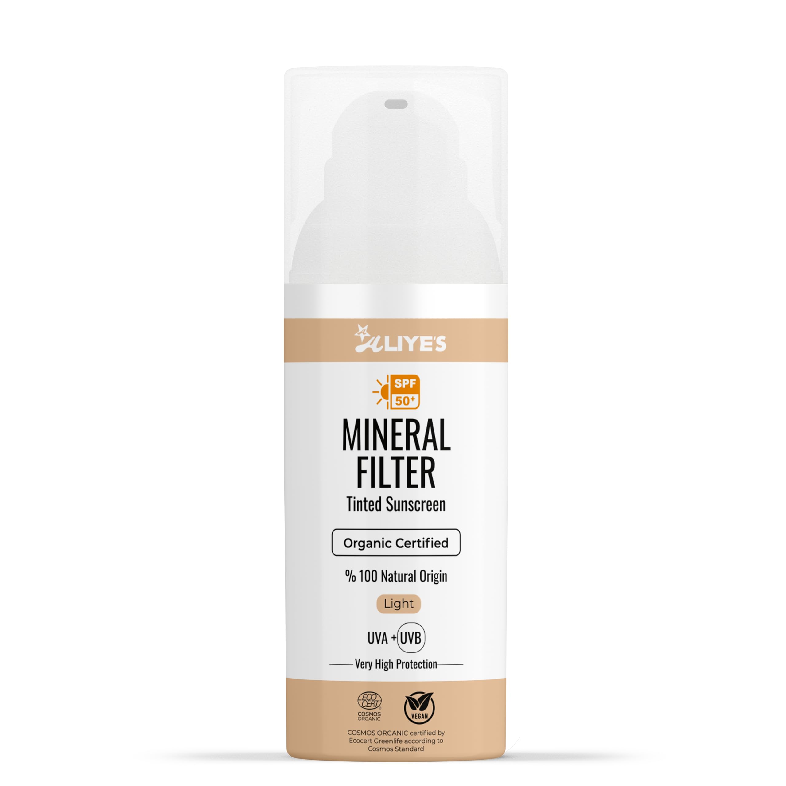 Aliye s Tinted Organic Sunscreen SPF 50+ | Ecocert Cosmos Certified | 100% Mineral & Vegan Sun Protection | Safe for Sensitive Skin | 50ml (1.69 FL OZ (Beige))