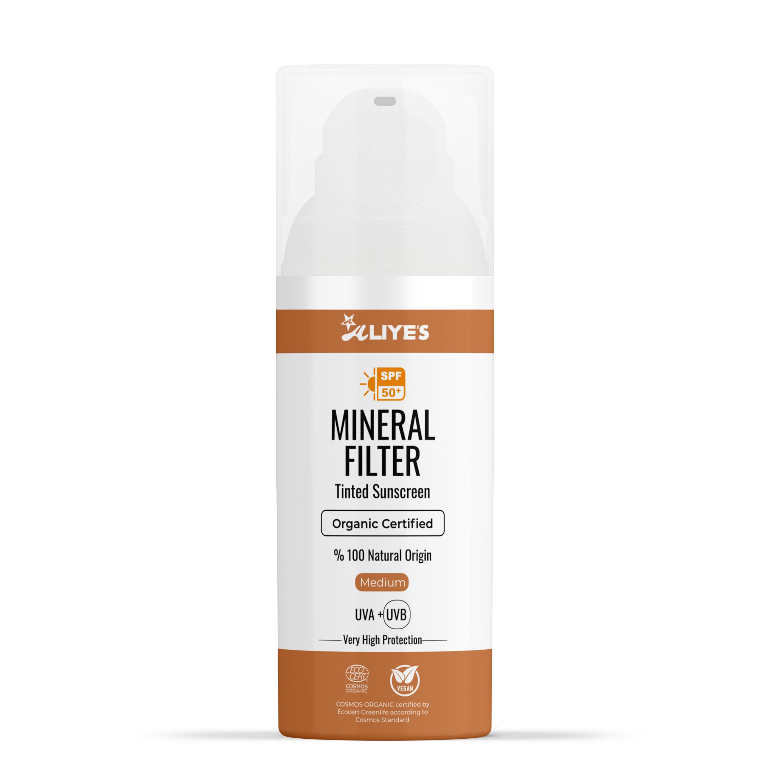 Aliye s Tinted Organic Sunscreen SPF 50+ | Ecocert Cosmos Certified | 100% Mineral & Vegan Sun Protection | Safe for Sensitive Skin | 50ml (Medium)