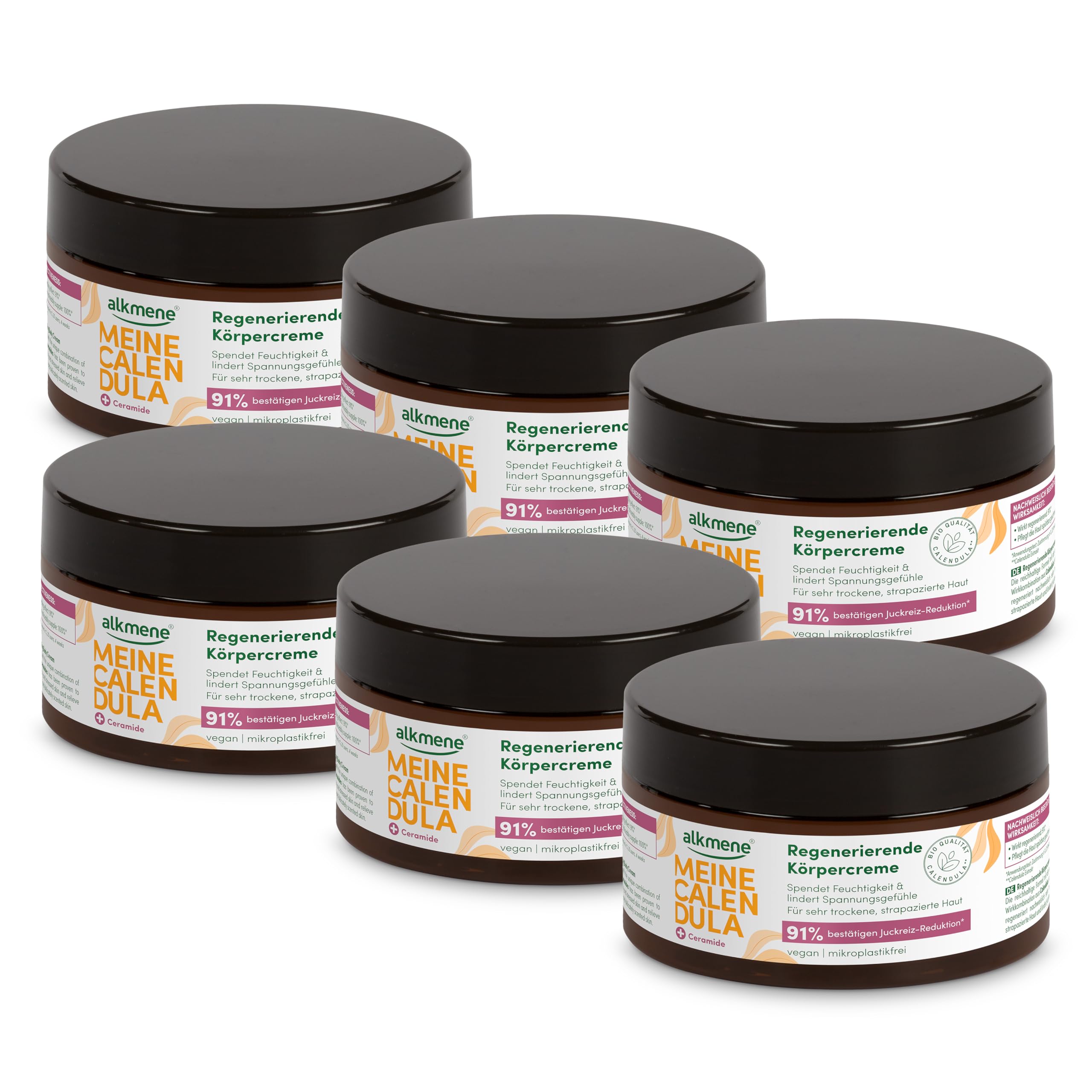 Contents: 6 x 200 ml Alkmene Rich Body Cream with Calendula – Dermatologically tested for skin tolerance – Made in Germany. Ceramide – known for its skin-regenerating and protective effect – Essential for maintaining our skin's protective barrier – Ideal for rebuilding the skin's protective barrier in sensitive or very dry skin. Calendula extract from controlled organic farming – Relieves tightness and itching caused by dryness – Ideal for dry, damaged, and chapped skin – The lipids it contains strengthen the skin barrier. Proven effectiveness – 100 noticeably improves skin suppleness – Reduces itching due to dry skin – 91 regenerating effect – Calendula cream for soft, delicately scented skin. Skin cream – The rich formula with the unique active combination of calendula and ceramides regenerates very dry and damaged skin and relieves itching.