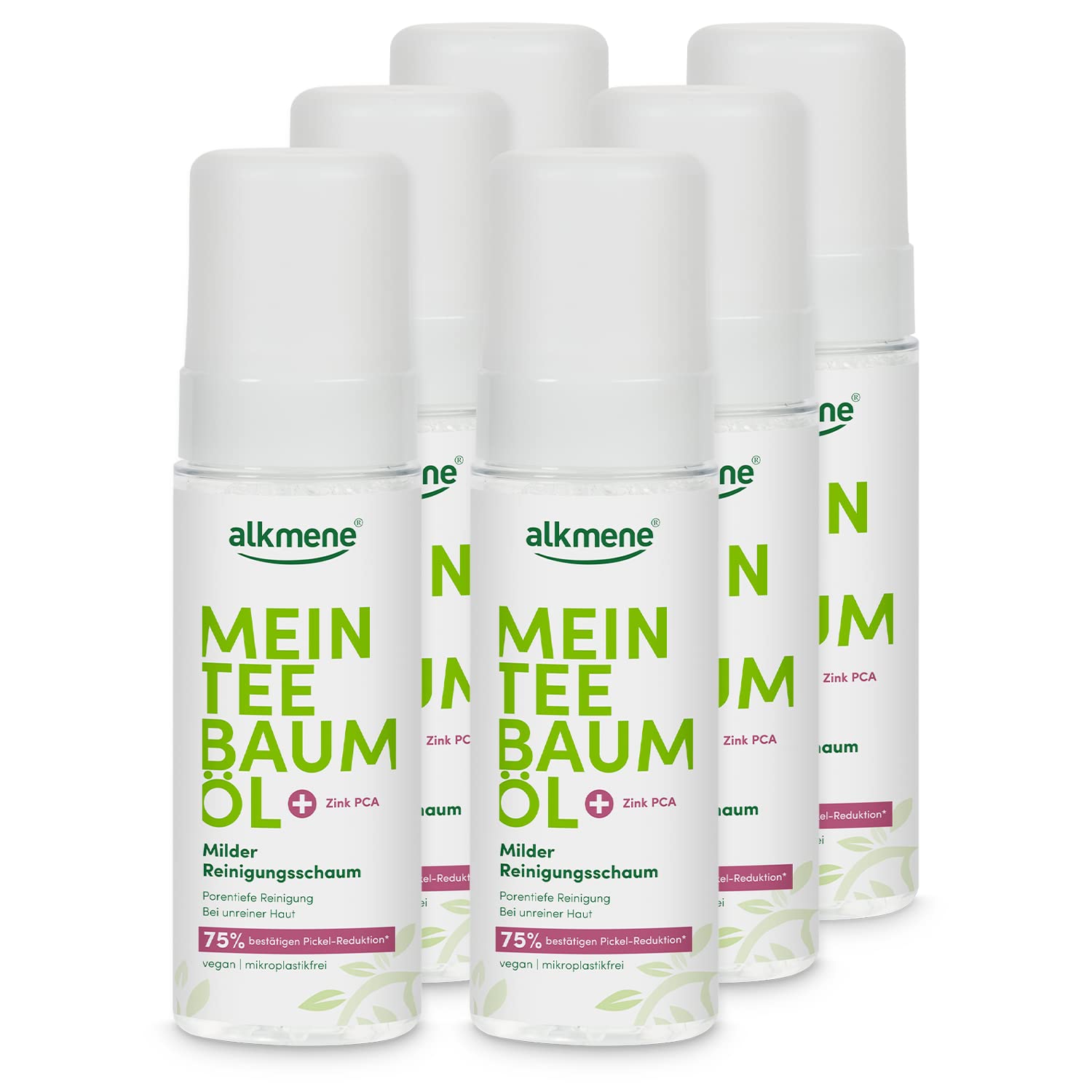 DELIVERY contains 6 x 200ml alkmene Australian Tea Tree Oil Facial Cleansing Foam - Vegan, paraben-free, silicone-free, and mineral oil-free - Hypoallergenic and dermatologically tested. APPLICATION - Apply morning and evening to damp skin, massage gently, avoiding the eye area, then rinse with water. Pharmaceutical-grade AUSTRALIAN TEA TREE OIL - The cleansing foam is vegan, paraben-free, silicone-free, and mineral oil-free. EFFECTIVE CARE - The particularly gentle foaming texture preserves the skin's natural moisture. It deeply removes dead skin cells, sebum, and makeup, optimally preparing the skin. CLEANSING FOAM - The highly effective formula with tea tree oil, witch hazel, and niacinamide gently and thoroughly cleanses and clarifies blemish-prone skin without irritating or drying it out.alkmene Nettoyant visage mousse à l'huile d'arbre à thé - mousse nettoyante visage et corps vegan, sans silicones, parabènes, huiles minérales - nettoyant visage homme femme (6x 200 ml)LIVRAISON contient 6x 200ml alkmene Mousse nettoyante visage à l'huile d'arbre à thé australien - Vegan, sans parabènes, sans silicones et sans huiles minérales - Hypoallergénique et testée dermatologiquement. APPLICATION - Appliquer matin et soir sur la peau humide, masser délicatement en évitant le contour des yeux, puis rincer à l'eau. HUILE D'ARBRE A THÉ AUSTRALIEN de qualité pharmaceutique - La mousse nettoyante est végane, sans parabènes, silicones ou huiles minérales. SOIN EFFICACE - La texture moussante particulièrement douce pour la peau préserve l'hydratation naturelle de la peau - Elle elimine en profondeur les peaux mortes, le sébum et le maquillage et prépare la peau de manière optimale. MOUSSE NETTOYANTE - La formule hautement efficace à base d'huile d'arbre à thé, d'hamamélis et de niacinamide nettoie et clarifie en douceur et en profondeur la peau sujette aux imperfections sans l'irriter ni la dessécher.