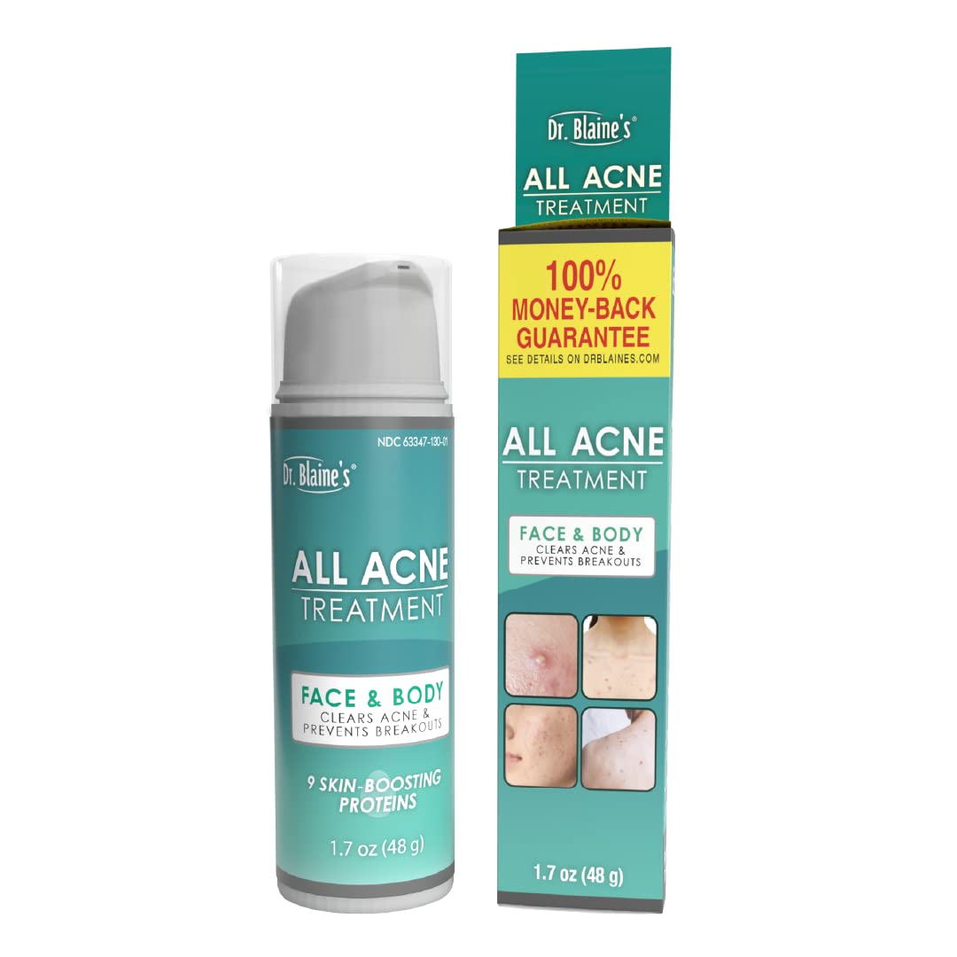 Dr. Blaine's All Acne Treatment quickly clears acne and prevents breakouts on the face, chest, shoulders, and back. Our all-in-one, prescription-strength formula contains fibrous proteins derived from eggshell membrane, including Hyaluronic Acid, Salicylic Acid, and Ovotransferrin to reduce inflammation, moisturize skin, increase elasticity, and promote anti-aging.