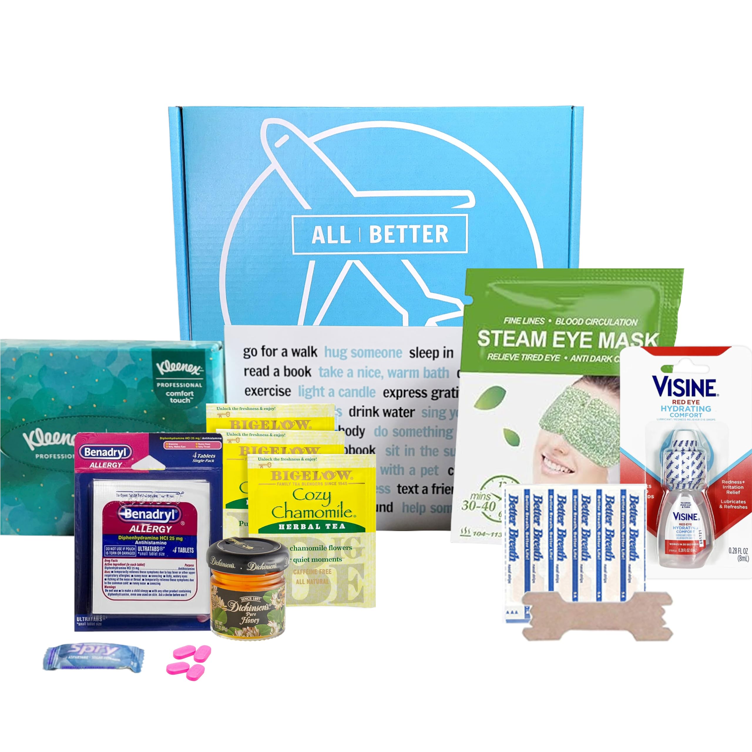 Introducing All Better Box No. 07! It's the perfect care package to help your friends or family recover quickly when they are experiecing seasonal allergies. With brand name wellness products included, this care package is specifically designed to provide relief from common symptoms associated with allergies such as eye inflammation, dryness, and congestion.