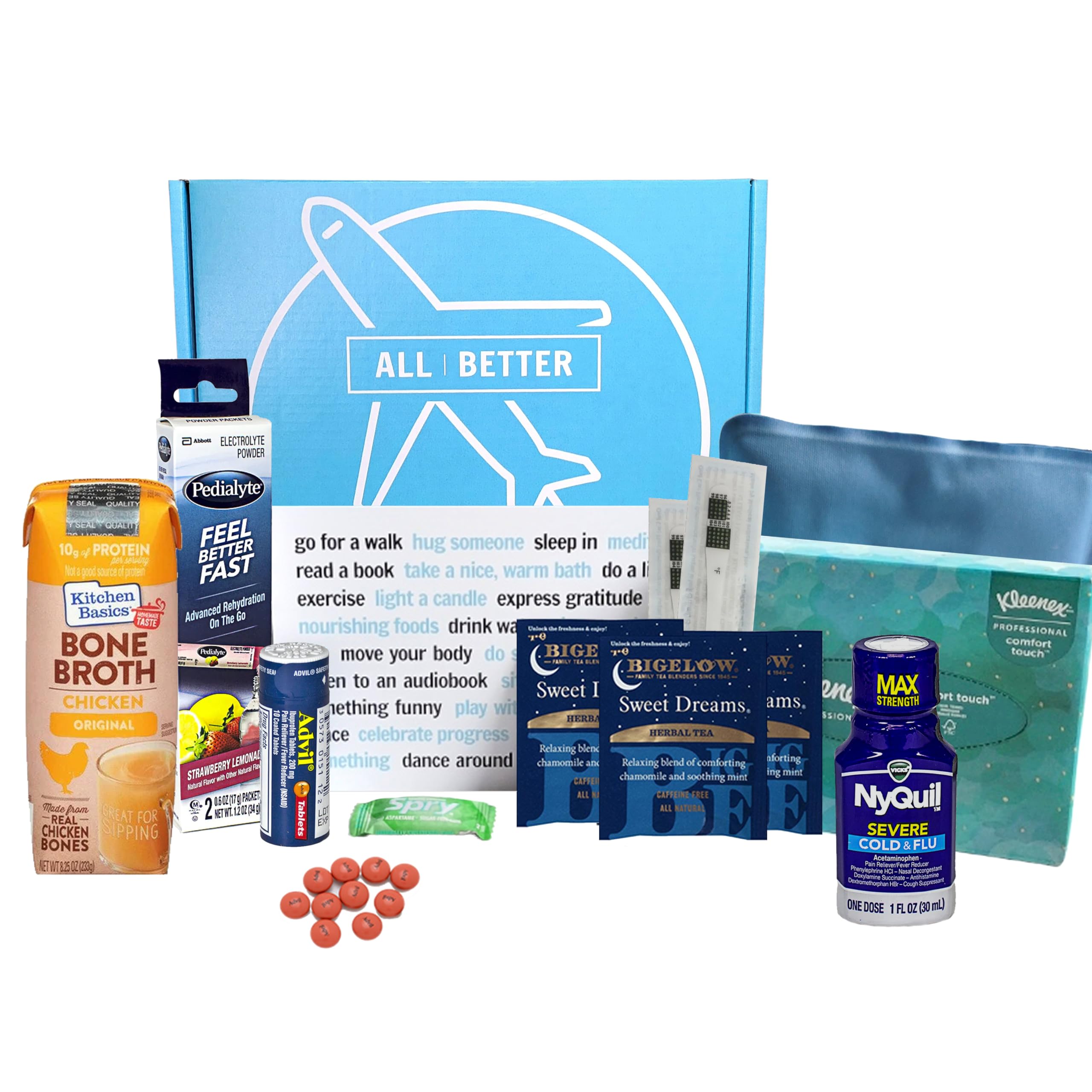 Introducing All Better Box No. 02 - the perfect solution for helping your friends and family feel better, faster when dealing with viral illnesses such as COVID and the flu. With brand name wellness products included, this care package is designed to help with a range of symptoms and provide comfort during recovery. All Better Box No. 02 contains practical self-care items that have been handpicked to ease both the body and mind, including ibuprofen, sleepytime tea, flu medicine, bone broth, and much more. By sending this care package, you can show your support and help those in need to recover from symptoms such as fever, pain, weakness, etc. At checkout, don't forget to include a personalized gift message to let them know you're thinking of them. The All Better Box No. 02 also comes with an All Better tips card that provides additional helpful information and advice on how to get better - fast. Sending an All Better box is the perfect solution for anyone looking to help their sick friends, family, women, college students, adults, and kids feel better fast. Make a difference in someone's life today by sending an All Better care package - because everyone deserves to feel better, especially when they're unwell.ADD A PERSONAL MESSAGE: Include a personalized gift message at checkout to accompany your All Better care package and All Better tips card. SURPRISE THEM WITH A NICE GESTURE: Easily brighten your sick friends, family, clients, or employees' sick day with a thoughtful delivery that is sure to make them feel thought of and cared for. ENCOURAGE THEIR SELF-CARE: Help hold them over for a day or two with hand-picked products that will help relieve symptoms like fever, pain, and weakness. INCLUDES THE SICK-DAY ESSENTIALS: All Better Box No. 02 includes practical products to ease the body and mind while sick such as ibuprofen, sleepytime tea, flu medicine, bone broth, and more. SHOW YOU CARE, WITHOUT BEING THERE: Send an actual care package with brand name wellness solutions curated specifically to help with viral illnesses like COVID or the seasonal flu.