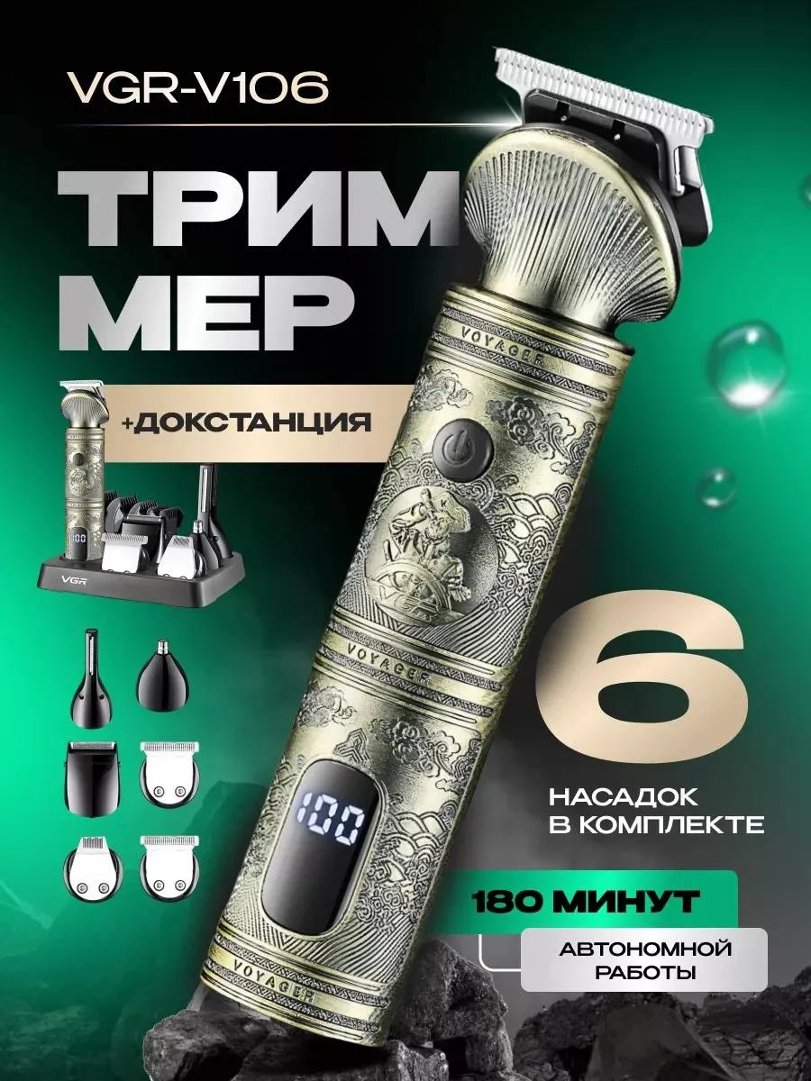 Набор для стрижки VGR V-106 — это многофункциональный триммер, который с легкостью заменит вам несколько устройств. Комплект из шести сменных лезвий из нержавеющей стали решает множество различных задач. Корпус триммера выполнен из металла золотого цвета, гравированного в морском стиле. В основании располагается светодиодный дисплей, отражающий остаточное время заряда в процентах. Работа триммера возможна как от сети, так и автономного аккумулятора. Литиевая батарея ёмкостью 1200 мАч гарантирует непрерывную работу в течении 180 минут, а благодаря разъему Type-С время полного заряда составляет лишь 1.5 часа.