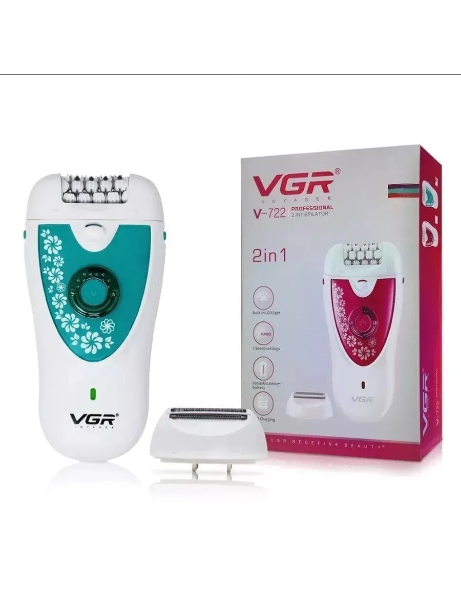 The VGR V-722 2-in-1 women's kit is a multifunctional device for women: an epilator and a razor with a shaver. Designed for removing unwanted hair from various areas of the body, including the face, bikini area, and underarms. The universal VGR V-722 women's epilator is battery-powered. Its cordless mode allows you to use the device anywhere, without the clutter of wires. A capacious 600 mAh battery provides 50 minutes of continuous use. It can be easily charged from any device in 1.5 hours. The epilator has 32 tweezers, allowing you to catch all hairs, from the smallest to the smallest. Its two-position design allows you to choose the most comfortable mode for you. Its compact size, light weight of just 150 grams, and ergonomic shape make it convenient to use and store. It's easy to hold, allowing for precise movements, especially in hard-to-reach areas. It's convenient to take an epilator with you on travel, vacation, or business trips. How do I choose the right attachment? Women's epilator: Ideal for legs, arms, and the bikini area. Women's razor: Suitable for sensitive areas like underarms and the bikini line. The VGR V-722 epilator is an excellent choice for those who want long-lasting smooth skin. Its versatility and effectiveness make it an indispensable addition to your beauty kit. A great gift for a woman, girlfriend, friend, mother, or daughter.