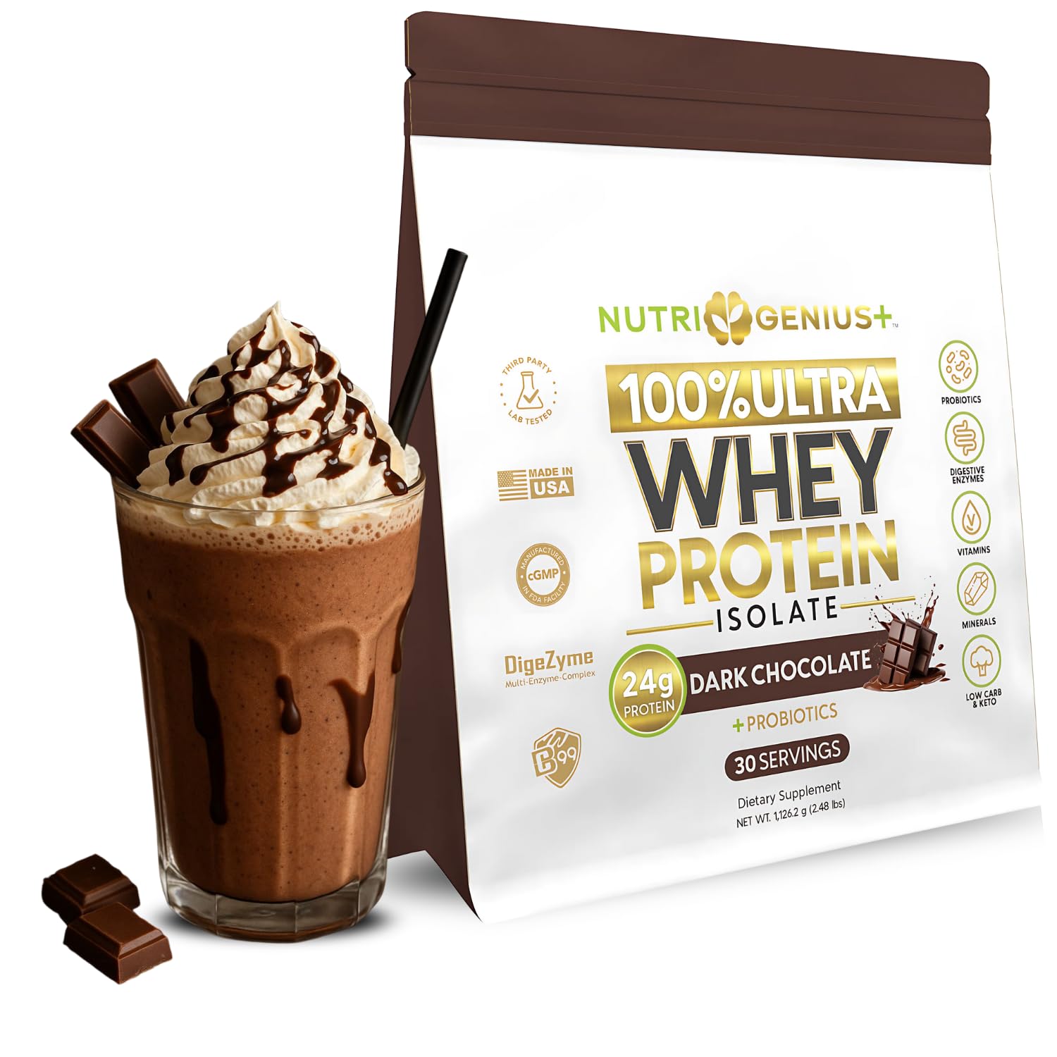 Fuel your body with Nutrigenius Whey Protein Isolate, the ultimate blend of 24g of high-quality protein, probiotics, digestive enzymes, vitamins, and minerals designed to support muscle recovery, digestion, immune health, and overall wellness. Support Muscle Growth Recovery: High Protein Content: Each serving provides 22–24g of fast-absorbing protein, essential for muscle repair and growth. Rich in BCAAs: Contains 5g of branched-chain amino acids (BCAAs), including 2.4g of leucine, which play a crucial role in muscle protein synthesis and recovery. Support Digestive Immune Support: Probiotics Digestive Enzymes: Formulated with added probiotics and digestive enzymes to enhance gut health and nutrient absorption. Essential Vitamins Minerals: Includes a blend of vitamins and minerals to support overall well-being and immune function. ? Support Weight Management Nutrition Low Calorie Low Fat: Offers a lean nutritional profile with approximately 22 calories and 2g of fat per serving, making it suitable for weight management. Dietary Fiber: Contains 3g of dietary fiber per serving to promote satiety and support digestive health.