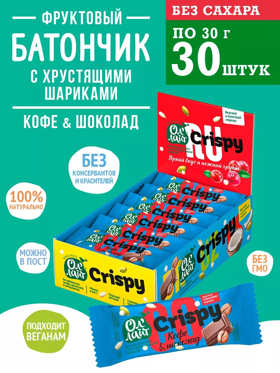 Фруктовый батончик Crispy с хрустящими шариками Ол'Лайт Кофе & Шоколад - 100% натуральный перекус.