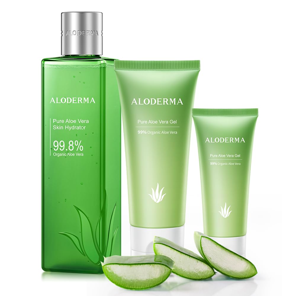 Aloderma: We are a family run farm-to-face skin care line focused on producing and creating high-quality organic aloe vera-based products in an ecologically friendly way. We grow organic aloe vera on our own farms and manufacture all of our products in our factory, which are certified USDA and European Union organic by ECOCERT. Aloderma has over 20 years of working with Aloe providing high quality and affordable products for beauty, health and wellness. Made within 12 Hours of Harvest: At Aloderma, our skincare is rooted in the earth. Our Aloe is processed on-site and turned into final products within hours of leaving the fields to ensure that we capture the natural power of Aloe Vera in every product we make. 45g Travel Size Aloe Vera Gel: Intense Hydration, Compact Size: Our 1.5oz Aloe Vera Gel packs a powerful hydrating formula in a travel size convenient product. Feel the relief as your skin absorbs this thirst-quenching aleo gel, leaving it soft, supple, and radiant. It improves overall skin elasticity so you can feel refreshed and revitalized everywhere you are. 114g Aloe Vera Gel: Enhance your natural beauty with the help of our aloe vera gel, delivering a surge of natural nutrients. Aloderma aloe vera gel for face body deeply hydrates and nourishes your skin, leaving it feeling refreshed and revitalized. It helps soothe and calm skin, giving you a feeling of relief and freshness. Skin Hydrator: Soothe and calm your skin with our Aloe Vera Toner, providing instant relief from redness and irritation, leaving your skin feeling soft and hydrated. It hydrates oily combination skin without over drying and maintains oil-water balance.