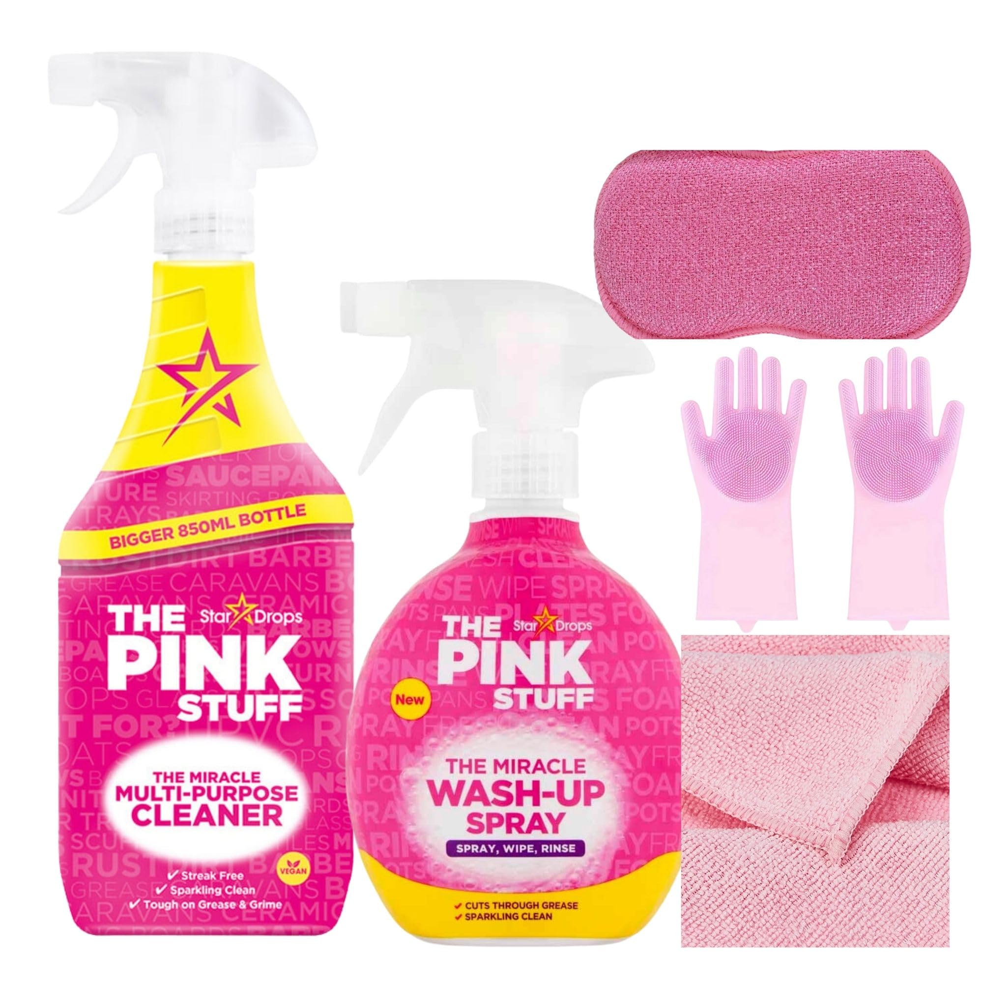 Say goodbye to tough stains and hello to a fresh and clean space with the All Purpose Pink Cleaning Products bundle. This bundle includes the highly praised pink stuff miracle wash-up spray and the miracle multi-purpose cleaner, along with all the essential tools you need to tackle any cleaning task. Plus, everything in this bundle is pink, adding a fun and stylish touch to your cleaning experience. The pink stuff miracle wash-up spray is a powerful cleaner that easily removes tough stains and grime. It works like magic, cutting through grease and dirt to leave your surfaces sparkling clean. The miracle multi-purpose cleaner is a versatile cleaner that can handle all sorts of messes. It effortlessly lifts dirt, stains, and spills, leaving no residue behind. This bundle also includes all pink rubber gloves, sponges, and a microfiber cleaning cloth. The gloves protect your hands while allowing you to move comfortably. The sponges are tough on stains but gentle on delicate surfaces. And the microfiber cloth is perfect for dusting, polishing, and getting a streak-free shine. Whether you love cleaning or just want an easy and effective solution, this bundle has got you covered. - 1 x 500ml Wash-up Spray - 1 x 850ml Multi Purpose Cleaner - 1 x Pink Microfibre Cloth (40cm x 30cm) - 1 x Duo Pro Pink Scrubber - 1pc 30cm x 13 cm Pink Kitchen Silicone Dishwashing Glove INGREDIENTS The Pink Stuff The Miracle Multi-Purpose Cleaner: contains amongst other ingredients: Less than 5 : Non-lonic Surfactants, Anionic Surfactants, Also contains Laurylamine Dipropylenediamine, Benzisothiazolinone and Perfume The Miracle Wash - Up Spray : 5-15 Anionic surfactants,Less than 5 Non-ionic Surfactants and Perfume. Contains Preservative:Benzisothiazolinone,Methylisothiazolinone,Laurylamine Dipropylenediamine.The cleaning products bundle includes a pink sponge for washing up scrubbing the kitchen sink, ensuring thorough cleaning sanitation, with an all-in-one kitchen cleaner spray solution. 100 easy use clear instructions solutions specially designed to give your kitchen a deeper cleaner look, requiring minimal effort to achieve effective results with included pink scrubber kit. The pink stuff is a tough cleaning paste that is gentle on surfaces but tough on stains. No harsh chemicals include all-natural ingredients, like baking soda, sodium silicate, quartz soap. Pink stuff stain remover is tough, penetrates and removes grease grime, leaving shiny clean results, while the kitchen cleaner spray transforms your dishes and surfaces leaving a sparkling finish. All purpose cleaner bundle contains 1x 850ml pink stuff multipurpose cleaner 1x 500ml spray wipe rinse pink stuff spray 1 x each all pink microfibre cleaning cloth,kitchen gloves washing up sponge.
