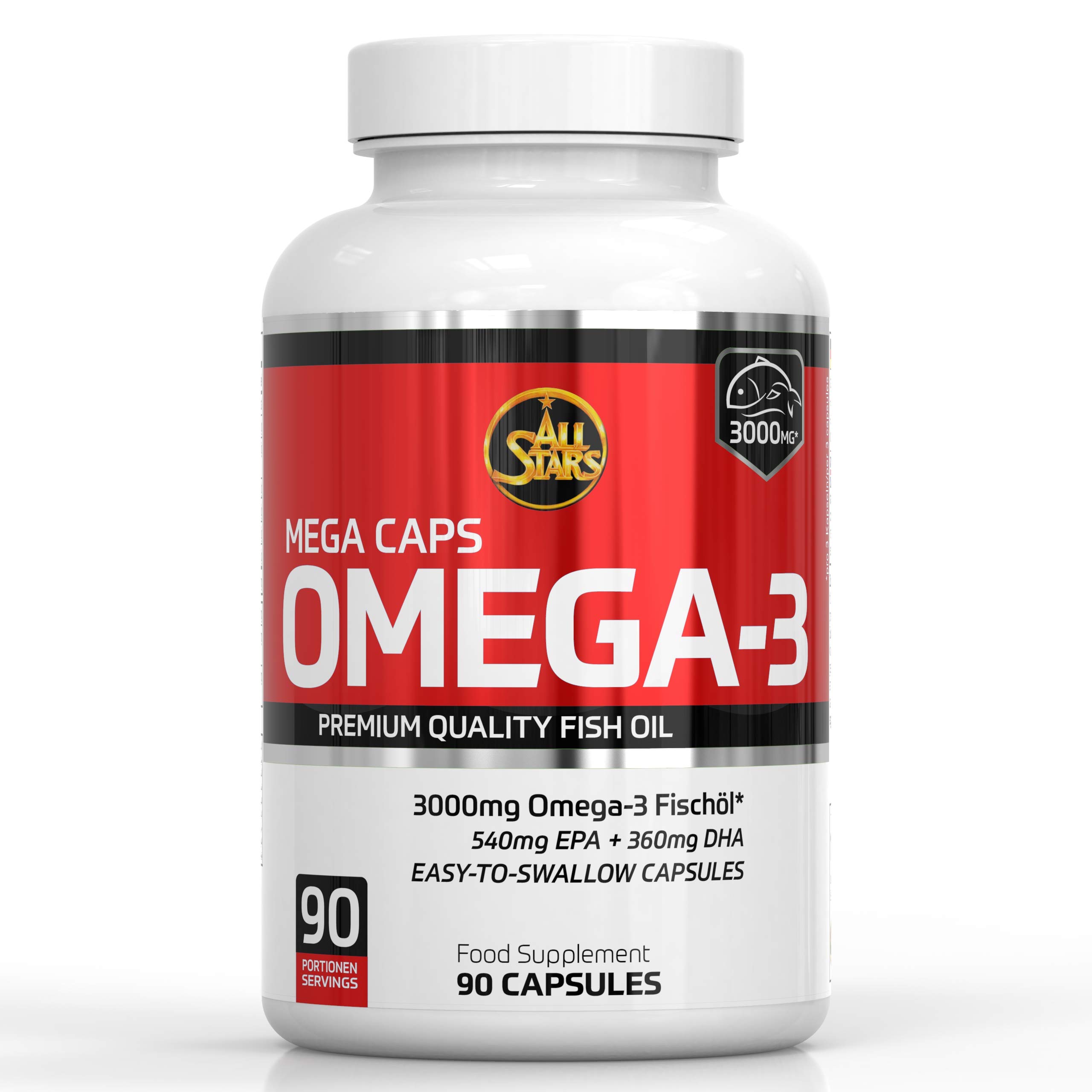 All Stars Omega 3 mega caps.Omega -3 provide EPA (eicosapentaenic acid) and DHA (docosahexaenoic acid) - two vital (essential), polyunsaturated fatty acids.The body needs EPA and DHA for numerous normal body functions, including important metabolic functions.Not only athletes appreciate sufficient omega-3 care.Omega-3 is absorbed through the food via fatty fish such as salmon or herring, but also algae, flax seeds, walnuts, paranese or sunflower seeds deliver omega-3 fatty acids.People with strong, physical stress, including athletes of all kinds, should pay particular attention to an adequate supply.The capsules are easy to swallow and deliver 1000mg fish oil per single dose, including 540mg EPA and 360mg DHA in premium quality.The capsules do without beta alanine, aspartam, creatine, sugar and other additives.Due to its ingredients, the supplement is compatible with a wide variety of diets, whether lowfat, ketogenic or metabolic diet.It is recommended to take 3 x 1 capsule with sufficient liquid over the day.The capsules serve as an enrichment of the daily, normal and balanced diet and can not only be used by athletes.All stars - All stars have been one of the most innovative supplement manufacturers worldwide for over 20 years.We only use the highest quality raw materials. Ingredients / ingredients Fish oil, beef gelatin (capsule shell), glycerin (capsule shell), water (capsule shell), antioxidant D-alpha tocopheryl acetate.Allergenan note: contains fish and products.Traces of gluten, chicken egg white, soy and milk (including lactose) cannot be excluded. Instructions 3 capsules per day.Swallow with sufficient liquid.The specified daily consumption of consumption must not be exceeded.Keep out of reach of small children.Be sure to pay attention to a balanced varied diet and a healthy lifestyle. Warnings The recommended daily dose should not be exceeded.Dietary supplements are not a substitute for a balanced and varied diet.Dietary supplements are to be kept outside the range of children. Address manufacturer/importer All Stars Fitness Products GmbH, Postfach 70, 82378 Peißenberg/FRG More All Stars - All Stars has been one of the most innovative supplement manufacturers worldwide for over 20 years.We only use the highest quality raw materials.Receiving - taking 3 x 1 capsule with sufficient liquid is recommended throughout the day.Not only athletes appreciate sufficient omega-3 care.For every nutrition - due to its ingredients, the supplement is compatible with a wide variety of diets, whether lowfat, ketogenic or metabolic diet.Without additives - the capsules completely do without beta alanine, aspartam, creatine, sugar & other additives.They contain almost no carbohydrates.High -quality fatty acids - the omega -3 capsules provide EPA (eicosapentaenic acid) & DHA (Docosahexaenic acid) - two vital (essential), polyunsaturated fatty acids. ALL STARS OMEGA 3 MEGA-CAPS. Omega-3 liefern EPA (Eicosapentaensäure) und DHA (Docosahexaensäure) - zwei lebensnotwendige (essenzielle), mehrfach ungesättigte Fettsäuren. Der Körper benötigt EPA und DHA für zahlreiche normale Körperfunktionen, darunter wichtige Stoffwechselfunktionen. Nicht nur Sportler schätzen eine ausreichende Omega-3 Versorgung. Über die Nahrung wird Omega-3 unter anderem über fetthaltige Fische wie Lachs oder Hering aufgenommen, aber auch Algen, Leinsamen, Walnüsse, Paranüsse oder Sonnenblumenkerne liefern Omega-3 Fettsäuren. Auf eine ausreichende Versorgung sollten Personen mit starker, körperlicher Belastungen, darunter auch Sportler aller Art, besonders achten. Die Kapseln sind leicht zu schlucken und liefern je Einzeldosis 1000mg Fischöl, darin 540mg EPA und 360mg DHA in Premium Qualität. Die Kapseln verzichten gänzlich auf Beta Alanine, Aspartam, Creatin, Zucker und andere Zusatzstoffe. Aufgrund seiner Zutaten ist das Supplement mit den verschiedensten Diätplänen kompatibel, egal ob LowFat-, ketogene oder metabole Diät. Empfohlen wird die Einnahme von 3 x 1 Kapsel mit ausreichend Flüssigkeit über den Tag verteilt. Die Kapseln dienen als Anreicherung der täglichen, normalen und ausgewogenen Ernährung und können nicht nur von Sportlern verwendet werden. ALL STARS - Seit über 20 Jahren zählt ALL STARS zu den innovativsten Supplement Herstellern weltweit. Wir verwenden ausschließlich Rohstoffe von höchster Qualität. INHALTSSTOFFE / ZUTATEN FISCHÖL, Rindergelatine (Kapselhülle), Glycerin (Kapselhülle), Wasser (Kapselhülle), Antioxidationsmittel D-alpha-Tocopherylacetat. Allergenhinweis: Enthält FISCH UND - ERZEUGNISSE. Spuren von GLUTEN, HÜHNEREI-Eiweiß, SOJA und MILCH (inkl. LAKTOSE) können nicht ausgeschlossen werden. GEBRAUCHSANWEISUNG 3 Kapseln pro Tag. Mit ausreichend Flüssigkeit schlucken. Die angegebene tägliche Verzehrmenge darf nicht überschritten werden. Außerhalb der Reichweite von kleinen Kindern lagern. Achten Sie unbedingt auf eine ausgewogene abwechslungsreiche Ernährung sowie eine gesunde Lebensweise. WARNHINWEISE Die angegebene empfohlene tägliche Verzehrsmenge darf nicht überschritten werden. Nahrungsergänzungsmittel sind kein Ersatz für eine ausgewogene und abwechslungsreiche Ernährung. Nahrungsergänzungsmittel sind außerhalb der Reichweite von Kindern aufzubewahren. ANSCHRIFT HERSTELLER/IMPORTEUR ALL STARS Fitness Products GmbH, Postfach 70, 82378 Peißenberg/BRD MehrALL STARS - Seit über 20 Jahren zählt ALL STARS zu den innovativsten Supplement Herstellern weltweit. Wir verwenden ausschließlich Rohstoffe von höchster Qualität. EINNAHME - Empfohlen wird die Einnahme von 3 x 1 Kapsel mit ausreichend Flüssigkeit über den Tag verteilt. Nicht nur Sportler schätzen eine ausreichende Omega-3 Versorgung. FÜR JEDE ERNÄHRUNG - Aufgrund seiner Zutaten ist das Supplement mit den verschiedensten Diätplänen kompatibel, egal ob LowFat-, ketogene oder metabole Diät. OHNE ZUSATZSTOFFE - Die Kapseln verzichten gänzlich auf Beta Alanine, Aspartam, Creatin, Zucker